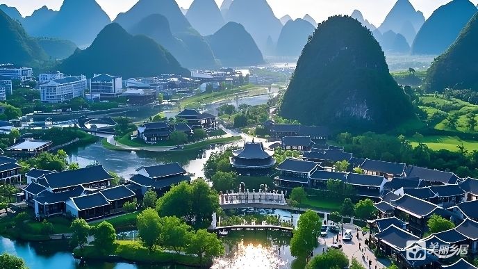 从更大的环境看,它位于一个被连绵青山环绕的宁静区域。航拍视角下,传统中式村落与现代化设施和谐共存,既有小桥流水的古朴意境,生活亦十分便利。