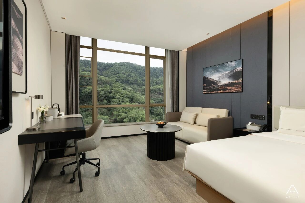 作为一家从地产开发起步的企业,浩昌实业集团对空间品质有着天然的敬畏与执着。中山火炬亚朵酒店以独栋建筑形态坐拥无遮挡大常山景观,超大面积落地幕墙玻璃将自然光线与四季山色引入室内,营造出开阔通透的视觉体验。