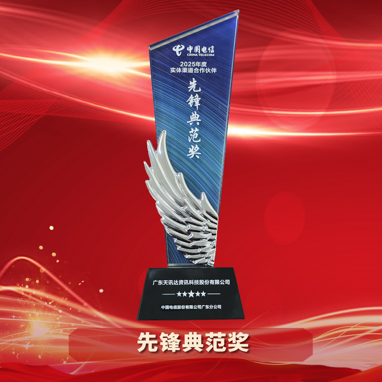 “先锋典范奖” 授予在业务发展综合考评中表现卓越的核心合作伙伴。天讯达深耕中山18载,作为中山市总部企业,我们在本地市场的渗透率与服务能力一直位居前列。此次斩获“先锋典范奖”,不仅是对我们全业务发展能力的肯定,更是对天讯达作为本地通信服务龙头企业地位的充分认可。