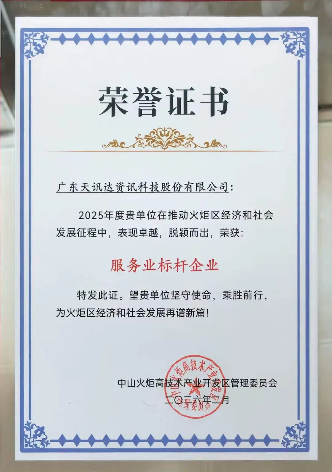 在日前中山火炬高新区隆重召开的2026年高质量发展大会上,广东天讯达资讯科技股份有限公司凭借在服务业领域的卓越表现和持续创新,荣获火炬高新区颁发的“服务业标杆企业”称号。