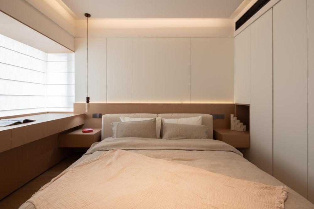 主卧飘窗下设计了梳妆桌和收纳空间,墙角内嵌踢脚线没有凸出面,扫地机器人能贴着墙根扫,一点卫生死角都没有。这些细节,不仔细看很容易忽略,但住进去之后,每一个都能在日常使用中感受到便利。