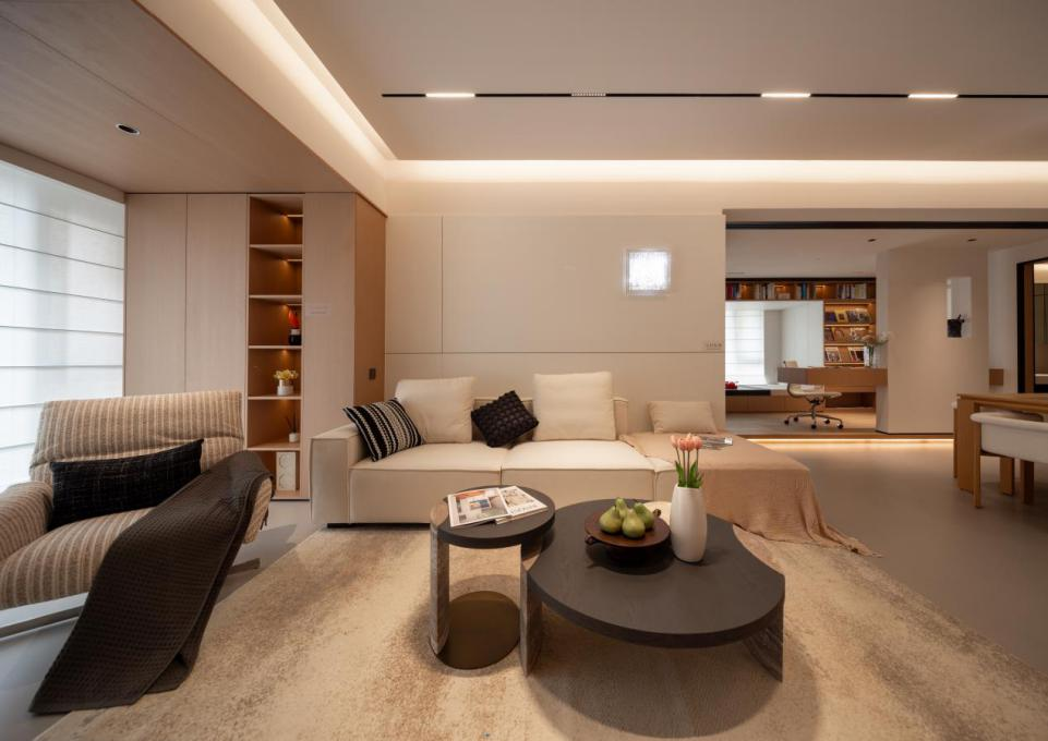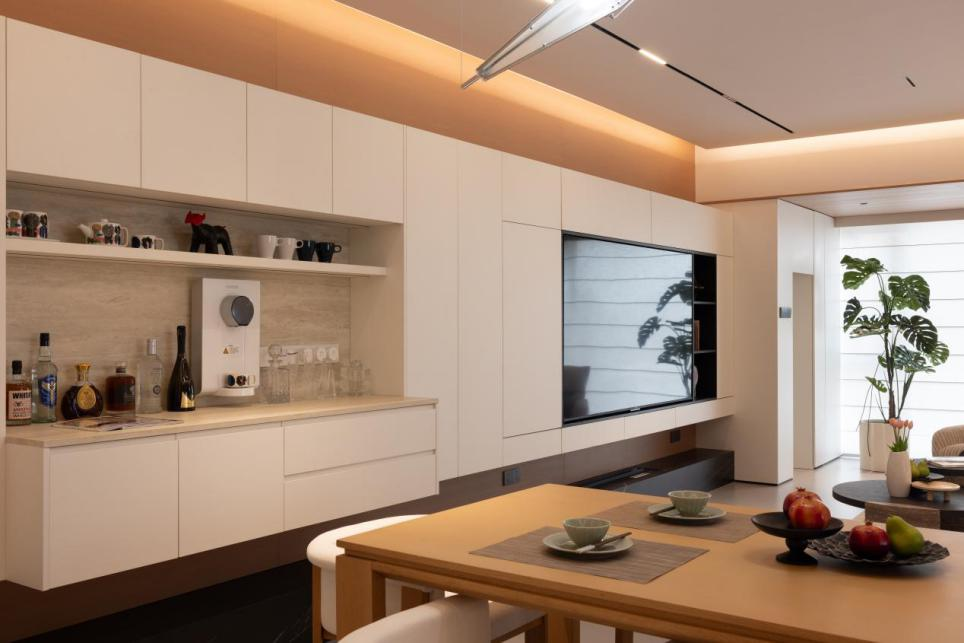 从这趟拉丝金属无轨玻璃门就可见轻奢的高品质,可推可藏,厨房瞬间从封闭变开放;洗手台外移后,次卧多出一整组嵌入式衣柜;就连电视背景墙都自带收纳属性。更让人意外的是,这个样板间几乎没有装修后常见的刺鼻气味。而材料的品牌也是精心挑选,例如冠珠瓷砖、科勒卫浴、法恩莎碗盘、美的风管机、华帝三件套等等。