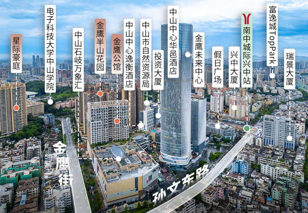 项目本身是一个约58万㎡的“城上之城”综合体:238米的金鹰未来中心是中山主城区第一高楼,也是中山唯一LEED金级认证商务建筑;中山石岐万象汇商场引入盒马等数百家中山首店品牌;洲际集团旗下中山中心华邑酒店、中山中心逸衡酒店双双落位,形成中山首家双品牌复合体酒店。