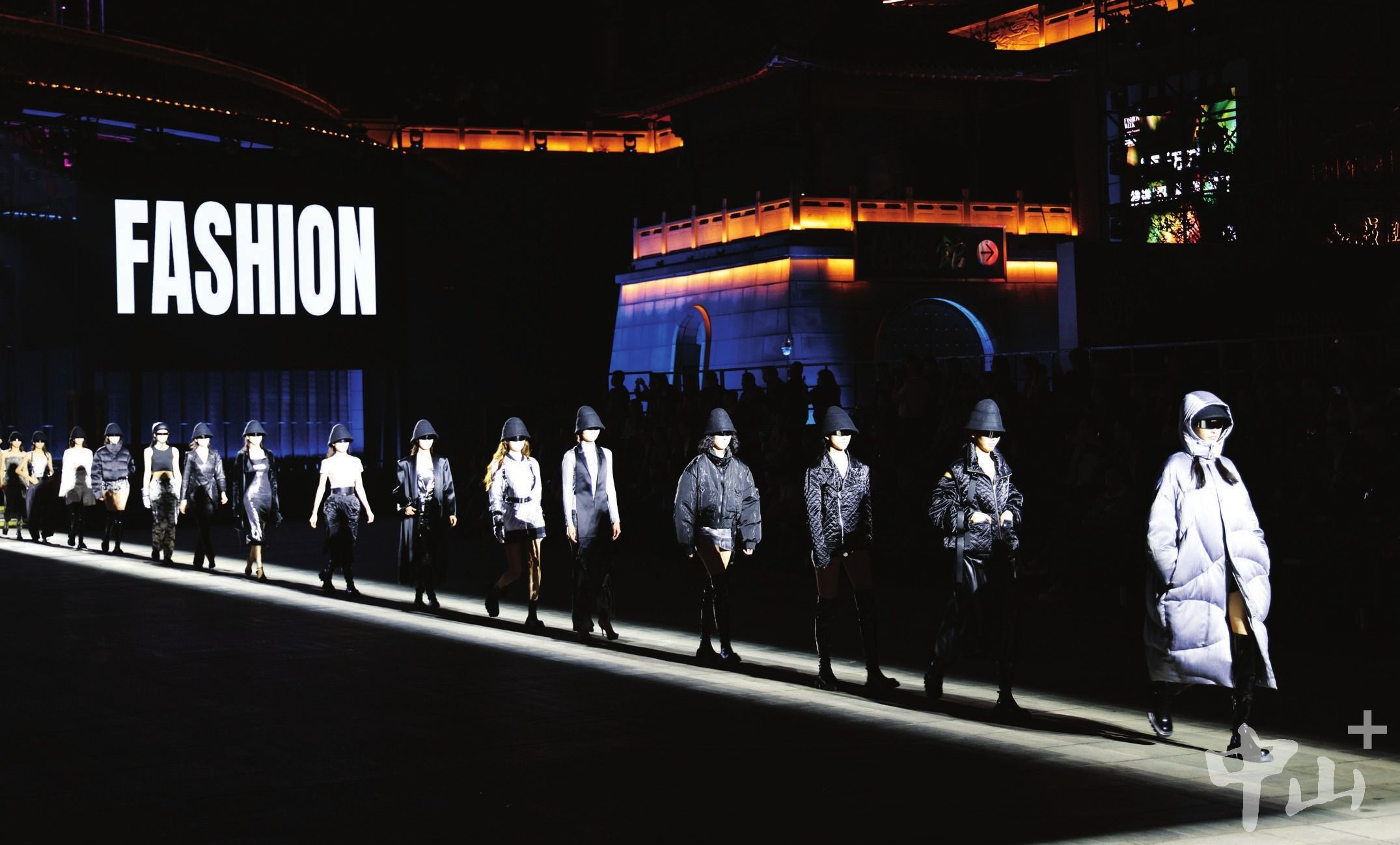 “过往秀”环节以红博城古建筑为舞台,借鉴“长安十二时辰”“长安三万里”的场景设计,身着唐装汉服的模特搭配凤凰灯光秀与火凤衔壶的唯美意境登场。衣袂翻飞间,汉唐锦绣风华被展现得淋漓尽致。“灯光打在古建筑上,配上传统服饰,就像走进了画里。”有观众由衷赞叹。