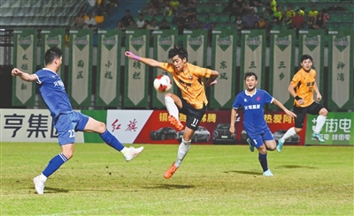 11月8日,中山市镇超足球联赛举行,火炬高新队(蓝衣)以5:4战胜小榄菊城队(黄衣)。比赛中,两队球员在积极拼抢。 记者 夏升权 摄