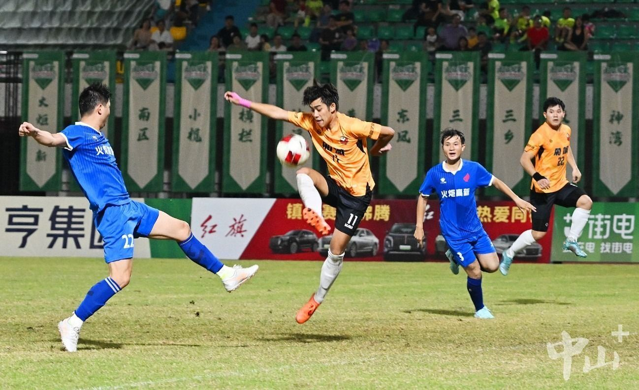 “中山镇超”比赛,火炬高新队(蓝色球衣)与小榄菊城队(橙色球衣)对战。