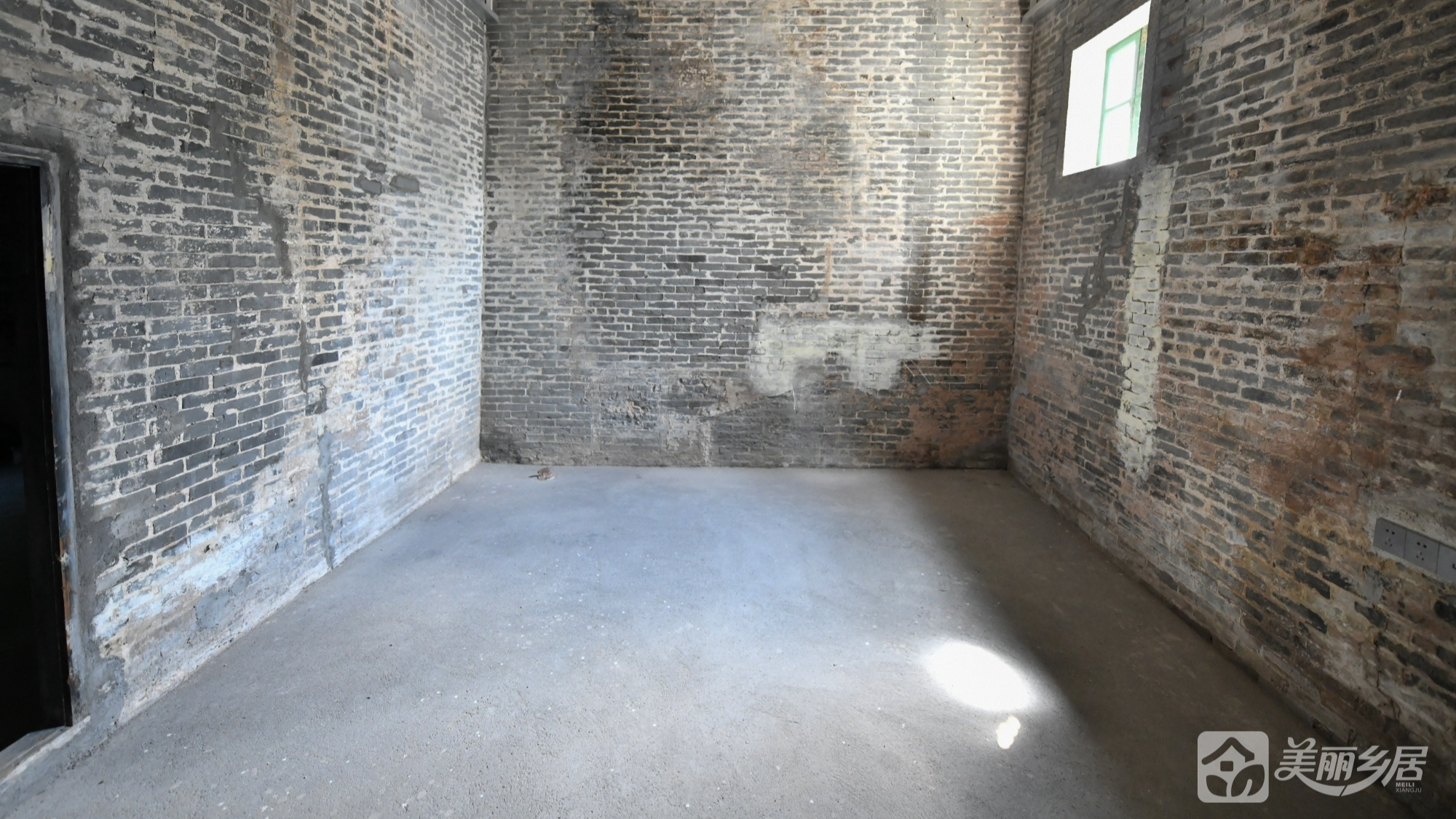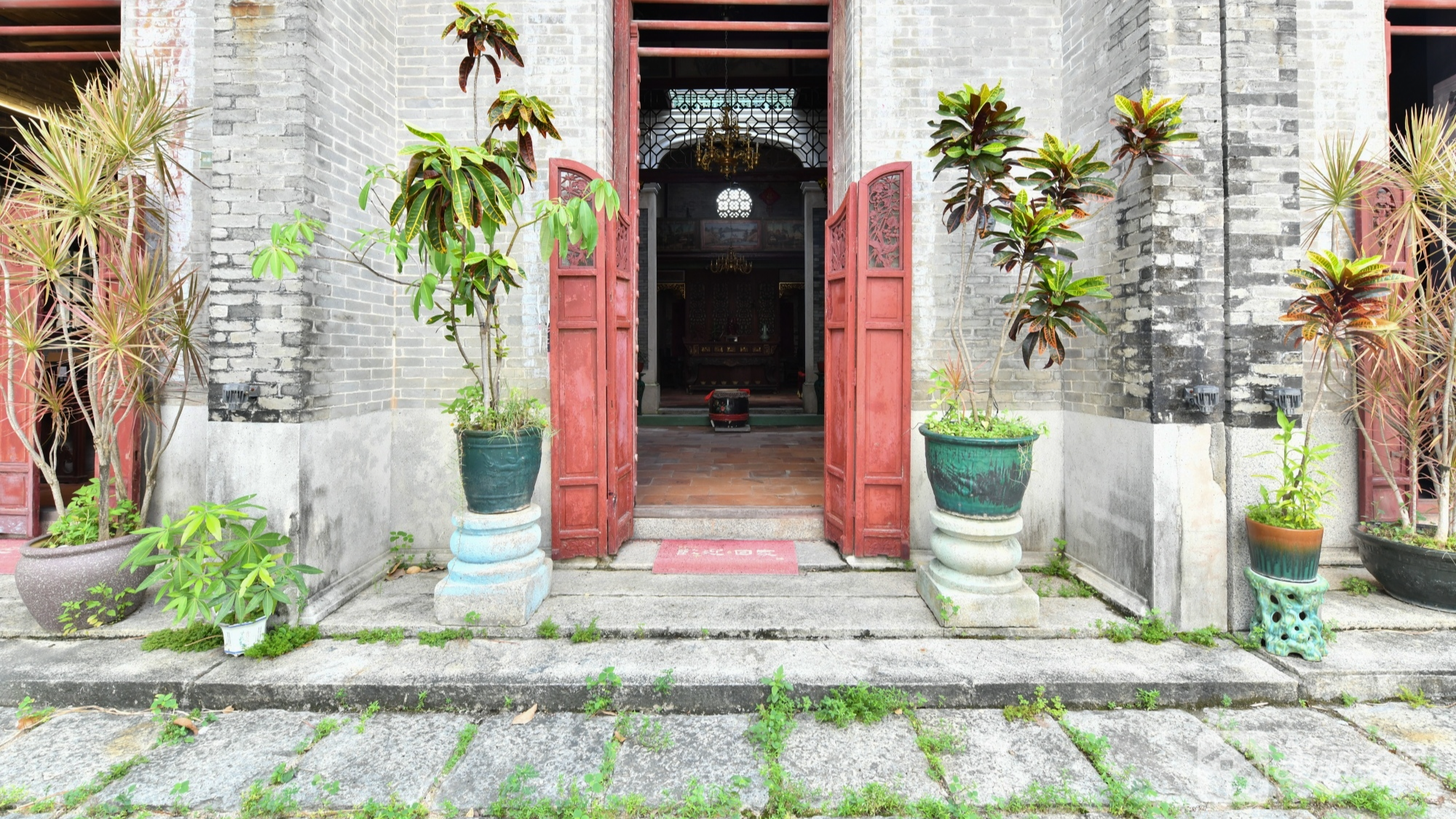 1. 入口区:斑驳灰砖墙配红木门与格栅,两侧绿植点缀。
