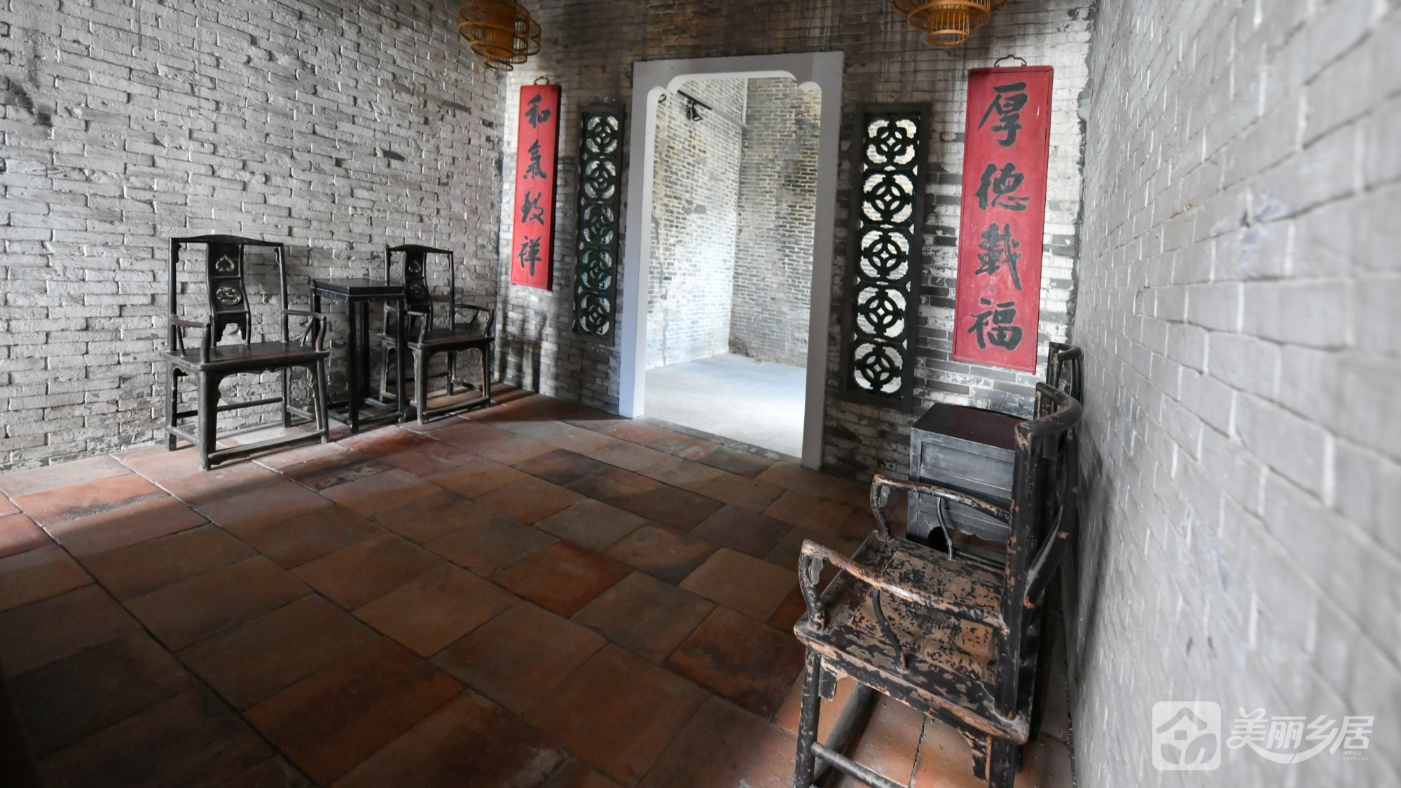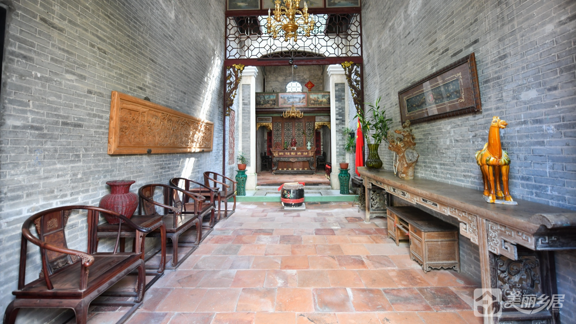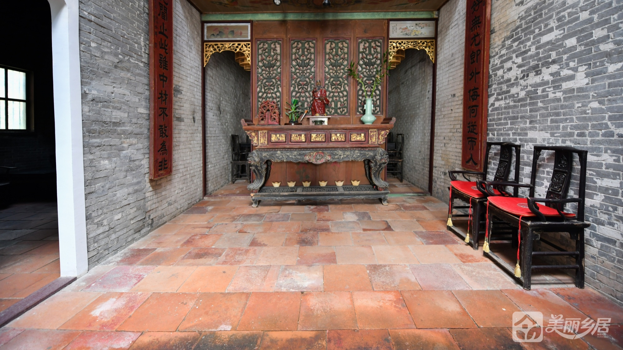 3. 神龛区:精美木雕神龛配金色吊灯,红褐地砖与对联传递家族礼制文化;黑色镂空窗棂与斑驳墙面的古朴氛围浓厚。