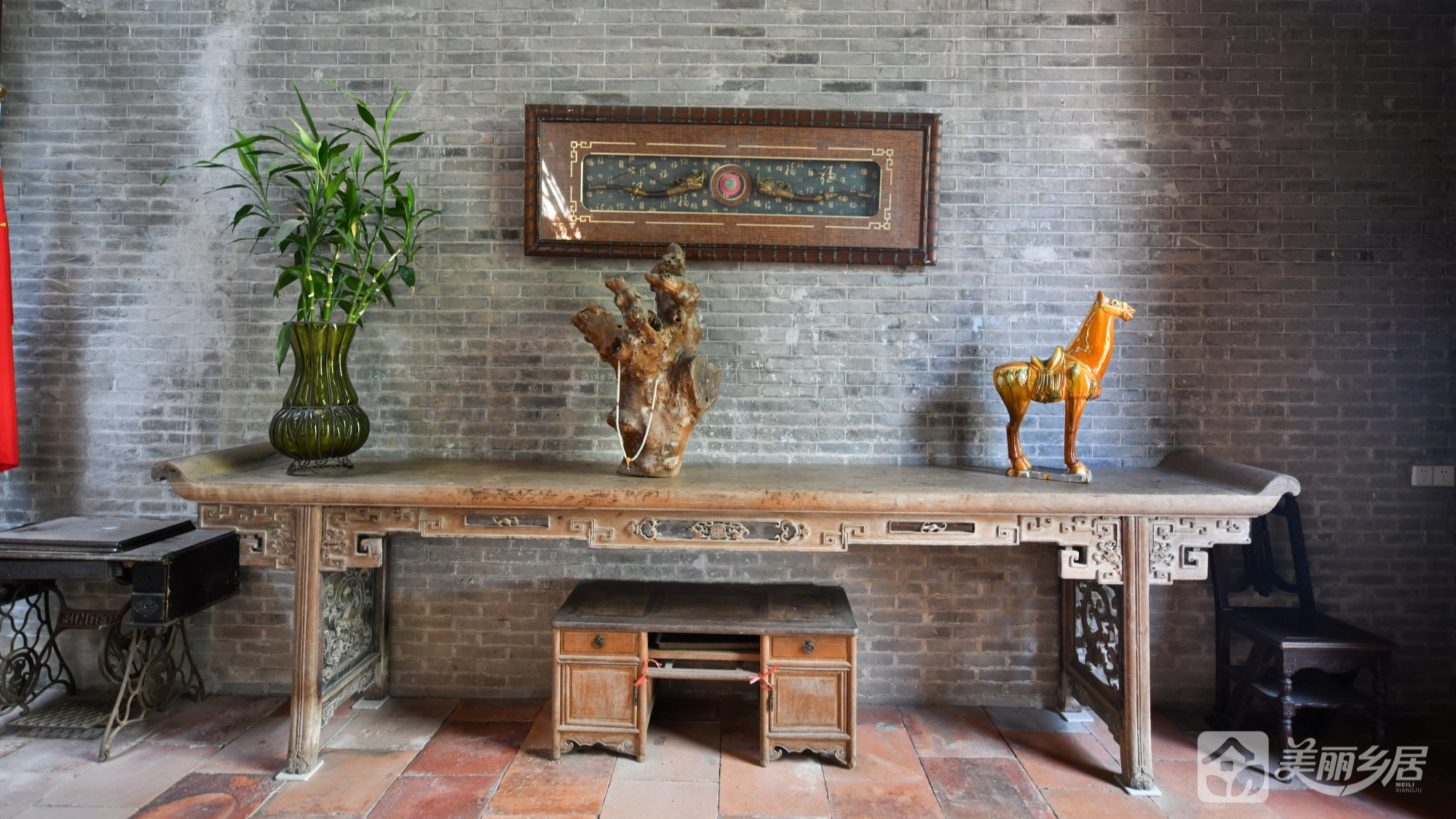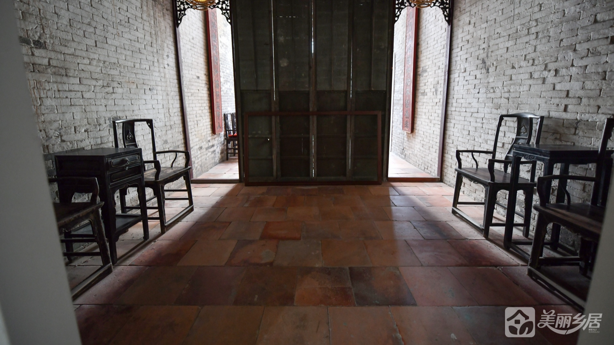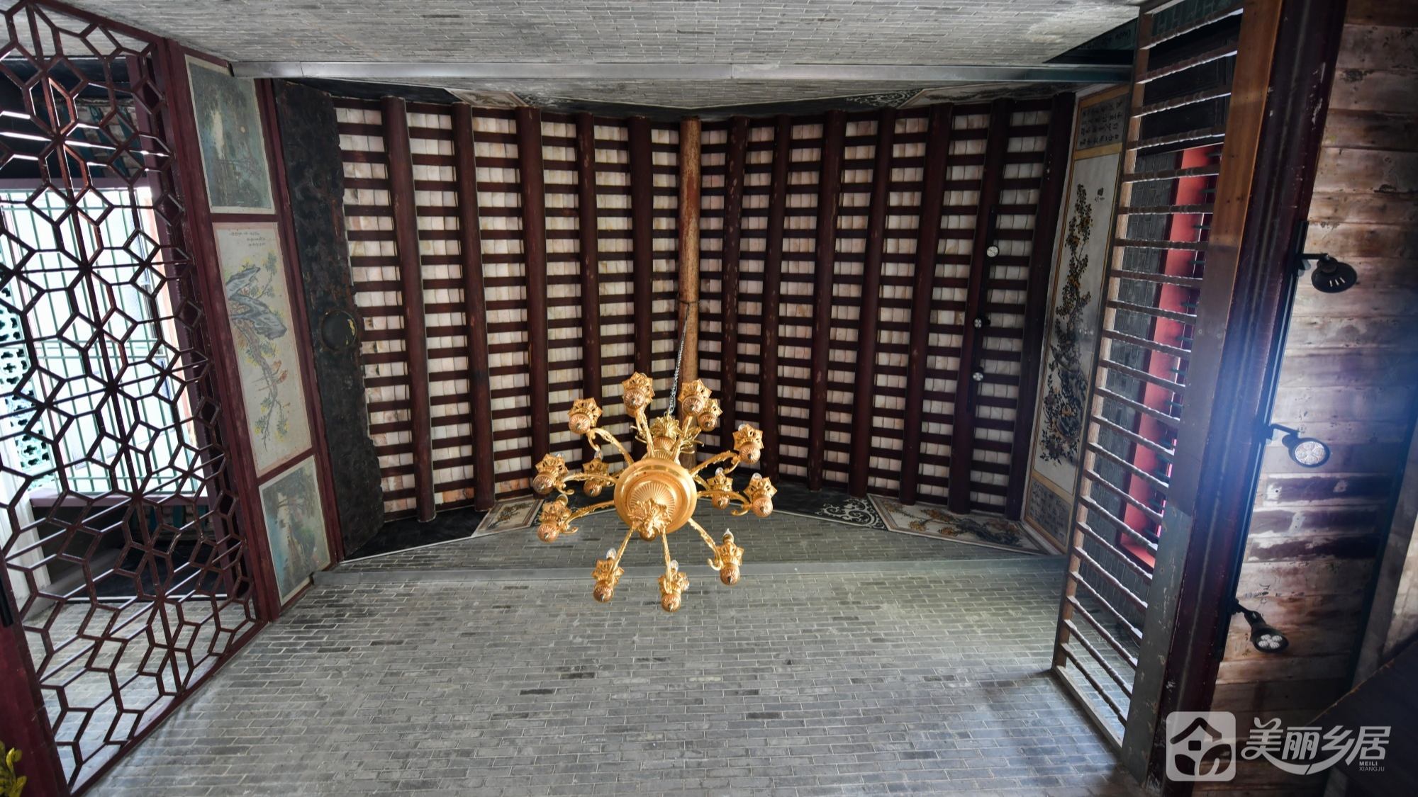 3. 神龛区:精美木雕神龛配金色吊灯,红褐地砖与对联传递家族礼制文化;黑色镂空窗棂与斑驳墙面的古朴氛围浓厚。