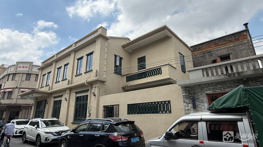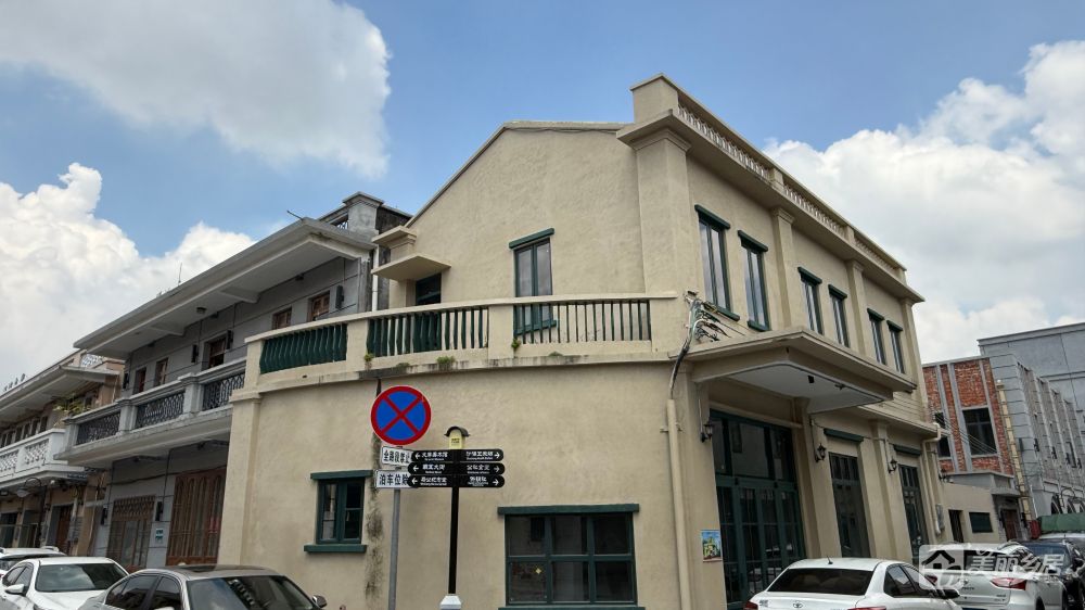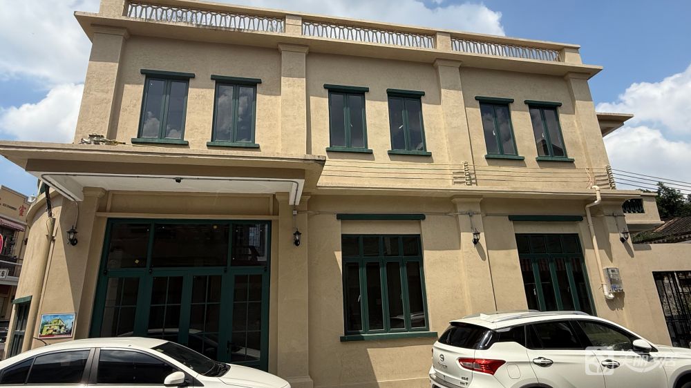 建筑为二层米黄色独立楼体,有中央庭院,周边为同年代风格建筑群,整体氛围复古且具历史厚度。建筑外立面以简洁素雅为基调,融合实用性与设计感;一层设大面积玻璃门窗,二层配备带黑色栏杆的阳台及顶部白色栏杆围合的露天露台(“空中楼阁大露台”),视野开阔,风景独好。