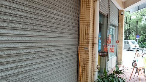 ¡ 商铺为独立门面,当前处于闲置状态,卷帘门为灰色金属材质;
