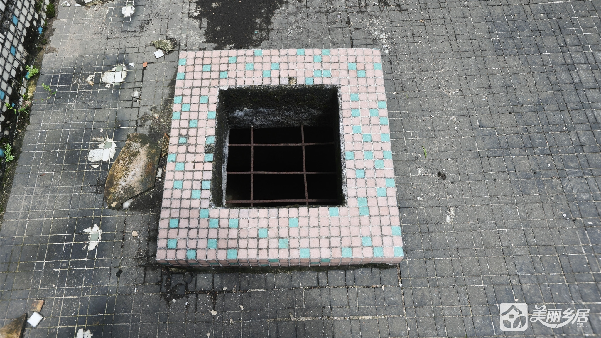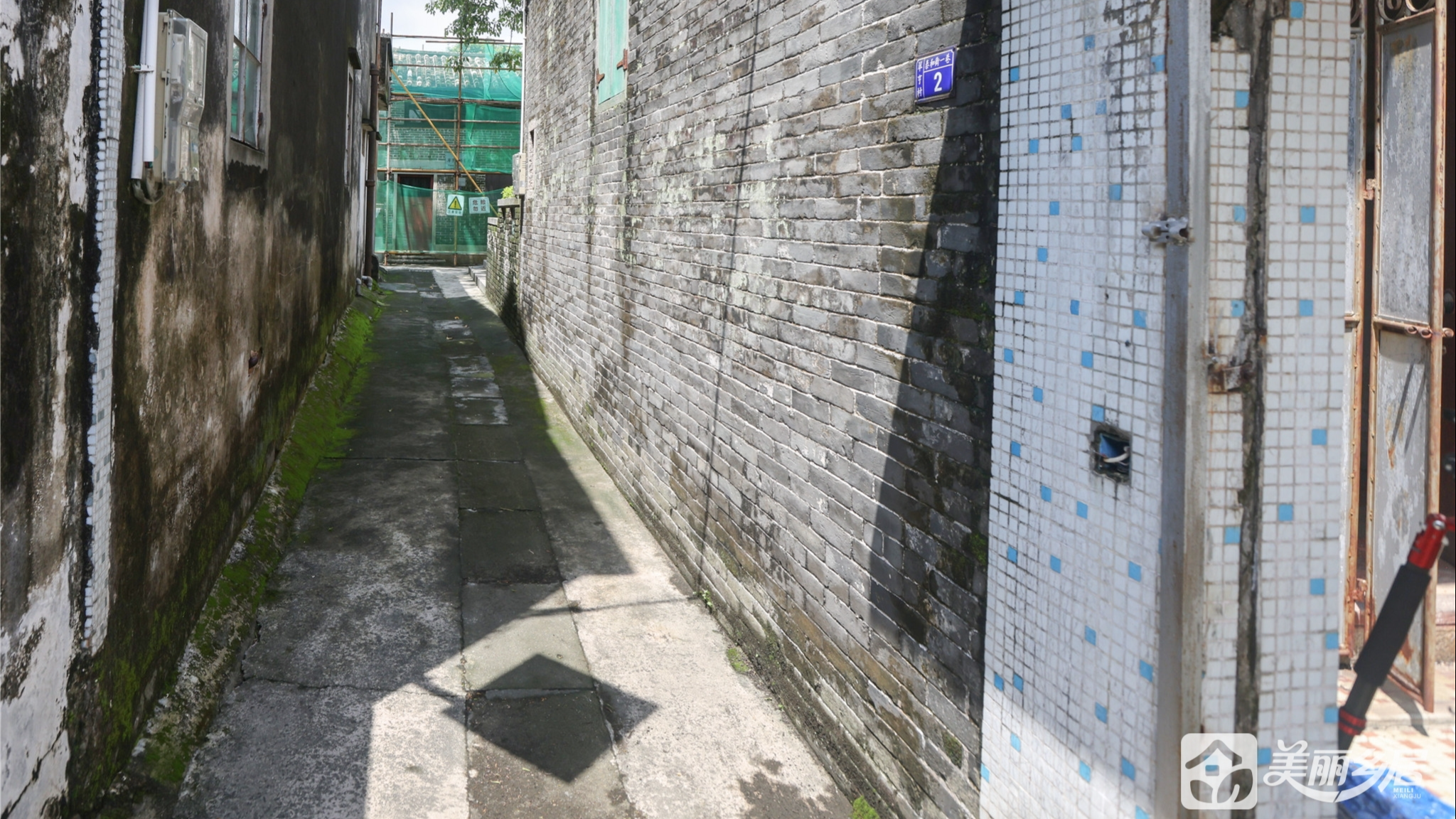 l 周边环境:建筑两侧为贴蓝白小瓷砖的联排墙体,背景融入古村落的日常烟火气,远处可见监控摄像头(暗示为保护区域),整体与村落风貌和谐统一。