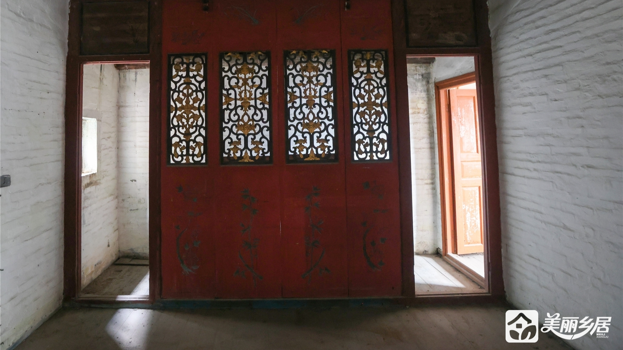 l 隔扇门:室内设一扇传统中式隔扇门(鲜艳红色,四块镂空花格雕刻精细,纹样可能为花卉或吉祥图案),漆色局部剥落(显露出木色底纹),嵌于白墙中,左右各有一门洞。