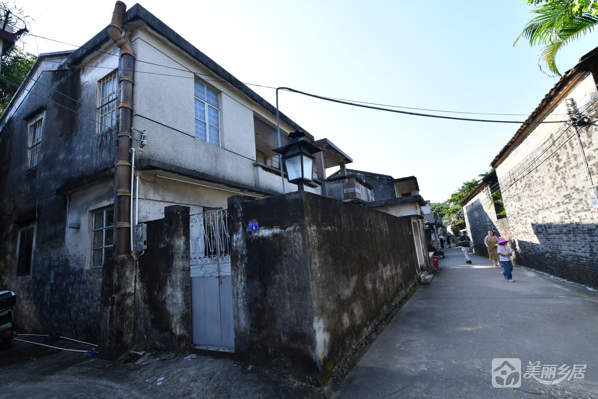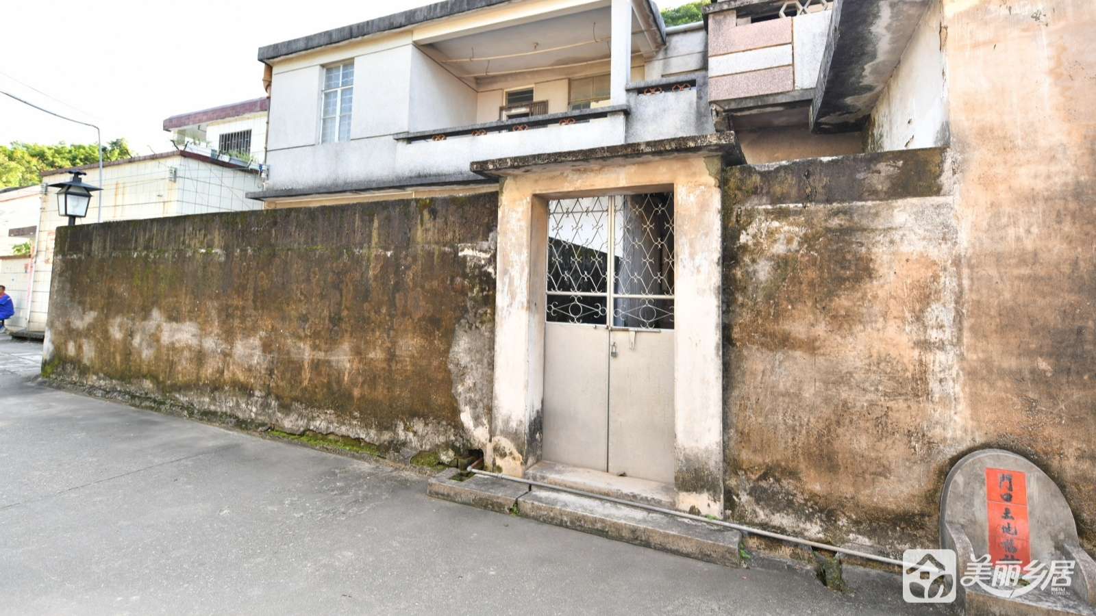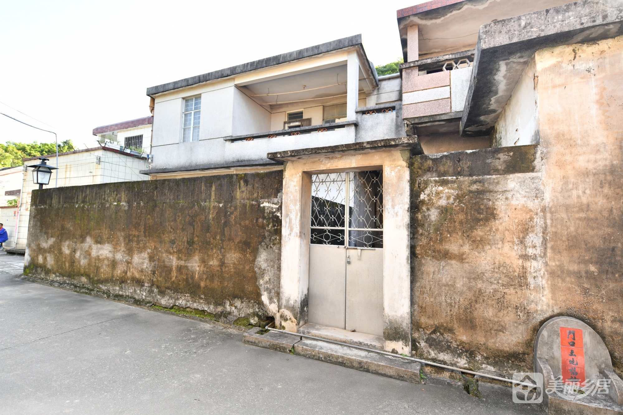 外观与结构:主建筑为完整两层砖石结构,外墙以灰白色为主。房屋左侧为深色围墙,表面棕褐斑驳、爬满青苔,设一双开铁门(带金属防护网,呈锁闭状态),门右侧围墙底部嵌一弧形石构件,贴有红色纸片,墨书“門口五地福坤”;围墙另设一扇花纹装饰铁门,旁立复古黑色路灯,添古朴气息。