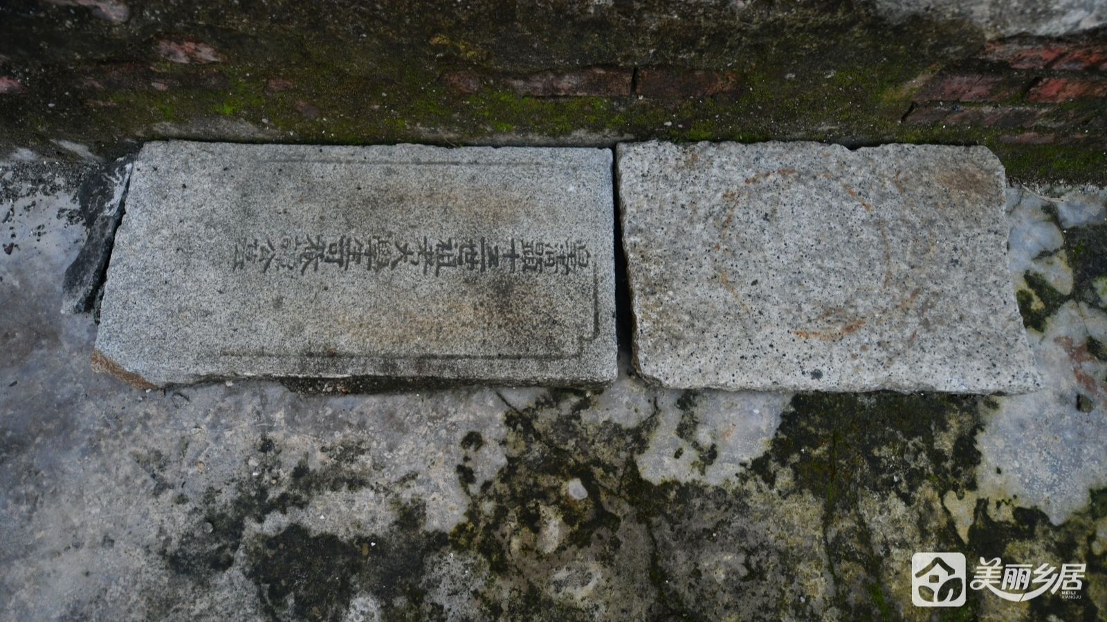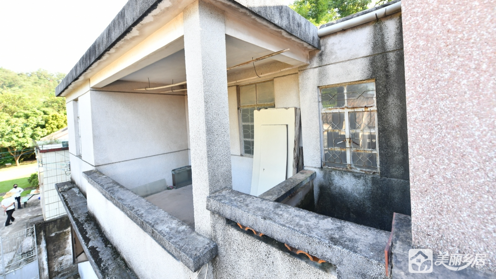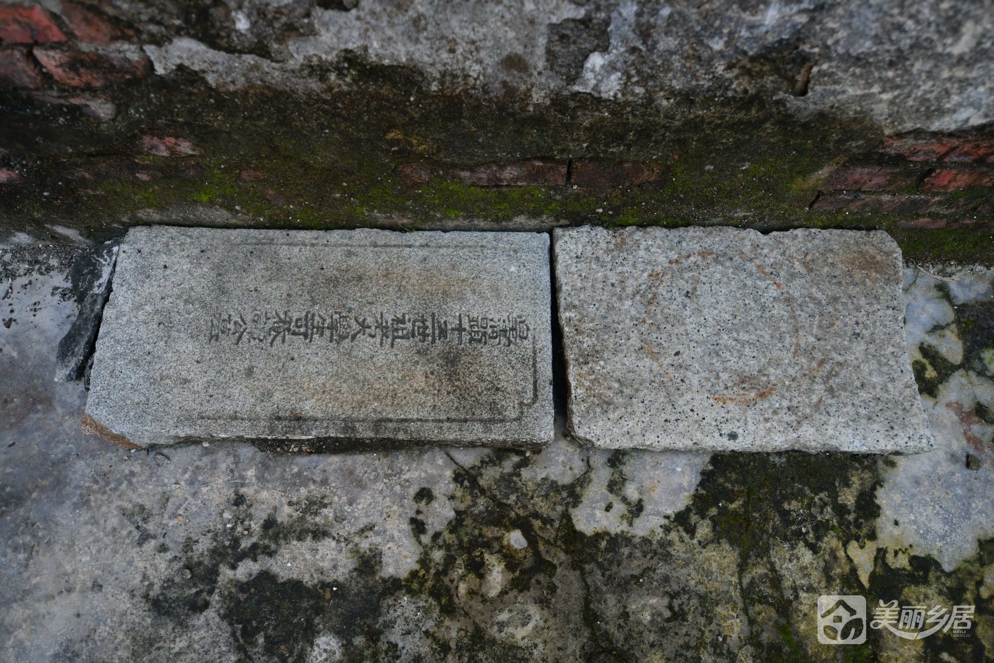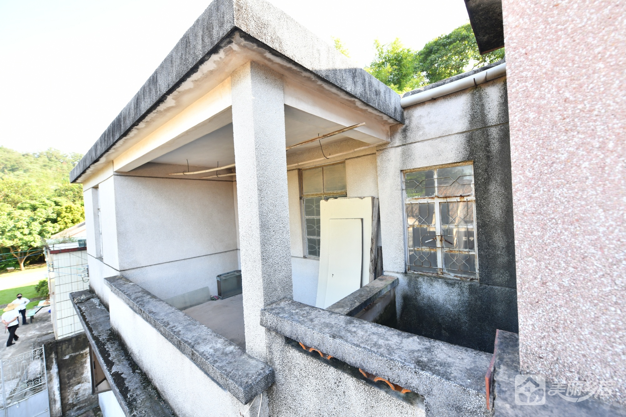 外观与结构:主建筑为完整两层砖石结构,外墙以灰白色为主。房屋左侧为深色围墙,表面棕褐斑驳、爬满青苔,设一双开铁门(带金属防护网,呈锁闭状态),门右侧围墙底部嵌一弧形石构件,贴有红色纸片,墨书“門口五地福坤”;围墙另设一扇花纹装饰铁门,旁立复古黑色路灯,添古朴气息。