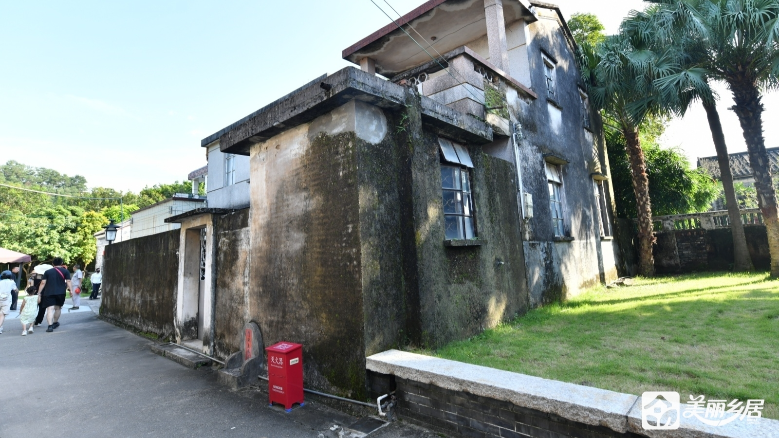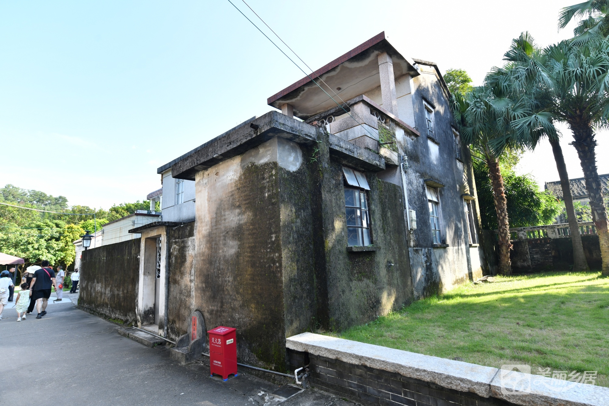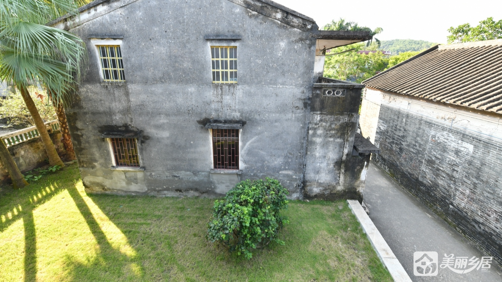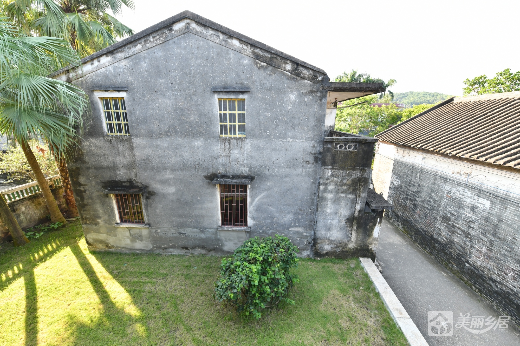 周边环境:主楼右侧为狭窄水泥小巷,对面是石砌民居外墙;后方延伸出草地,几棵高大棕榈树点缀其间,背景衬以葱郁树木与远山,环境静谧清幽。