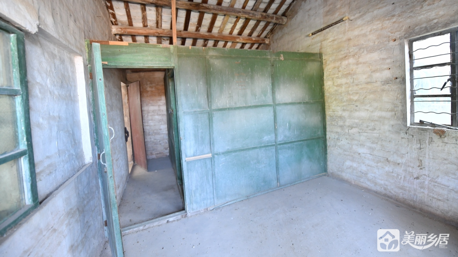 内部与细节:室内空旷简陋;左侧有一扇绿色边框木窗,与敞开的绿色隔板门相通,门板老旧、把手简单。