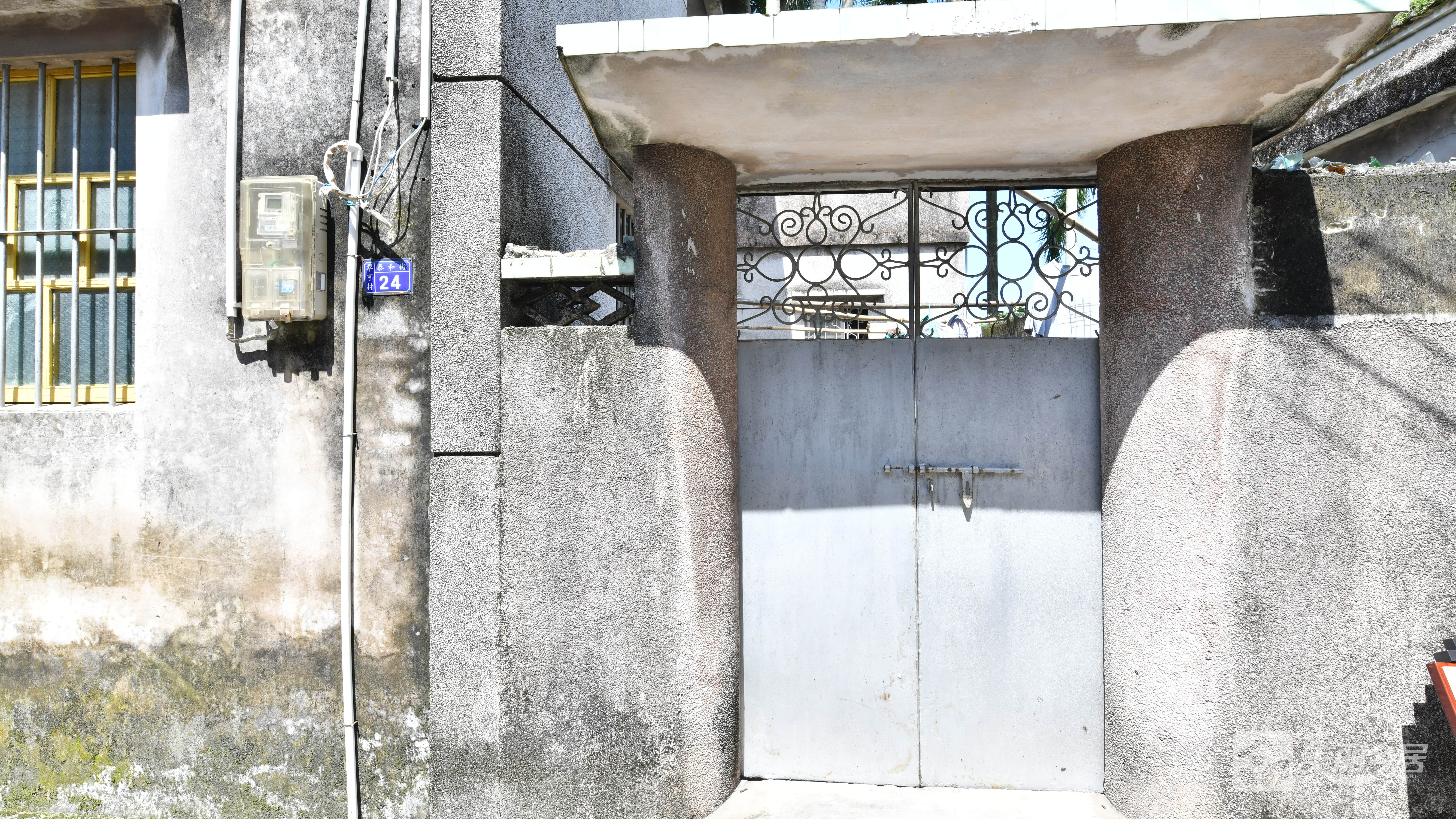 - 一层设双开铁栅栏门,金属把手及插销表面陈旧,存在氧化痕迹;门上方安装白色水泥遮阳棚,边缘因风雨侵蚀出现磨损,支撑圆柱为棕色,表面风化明显。