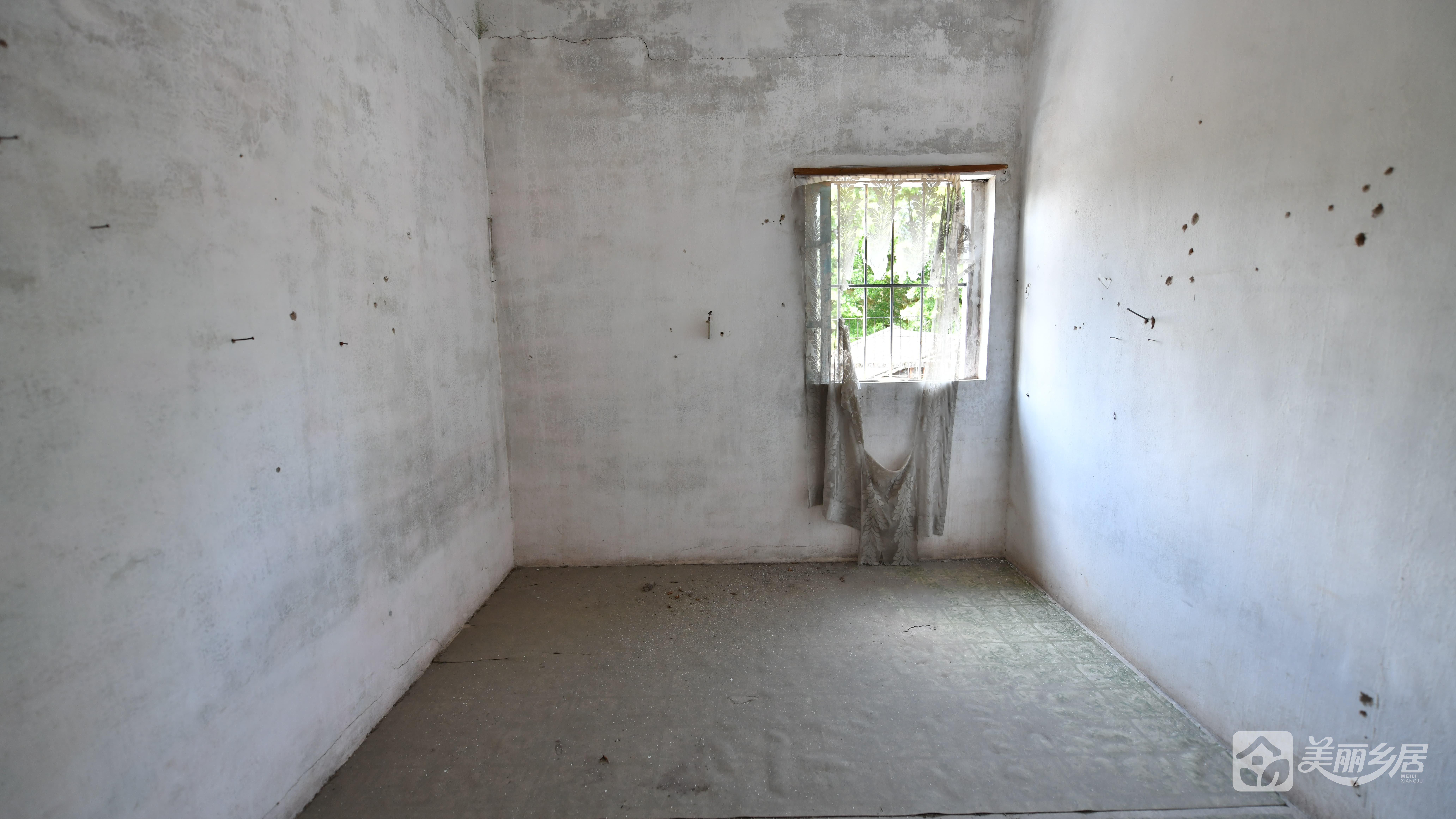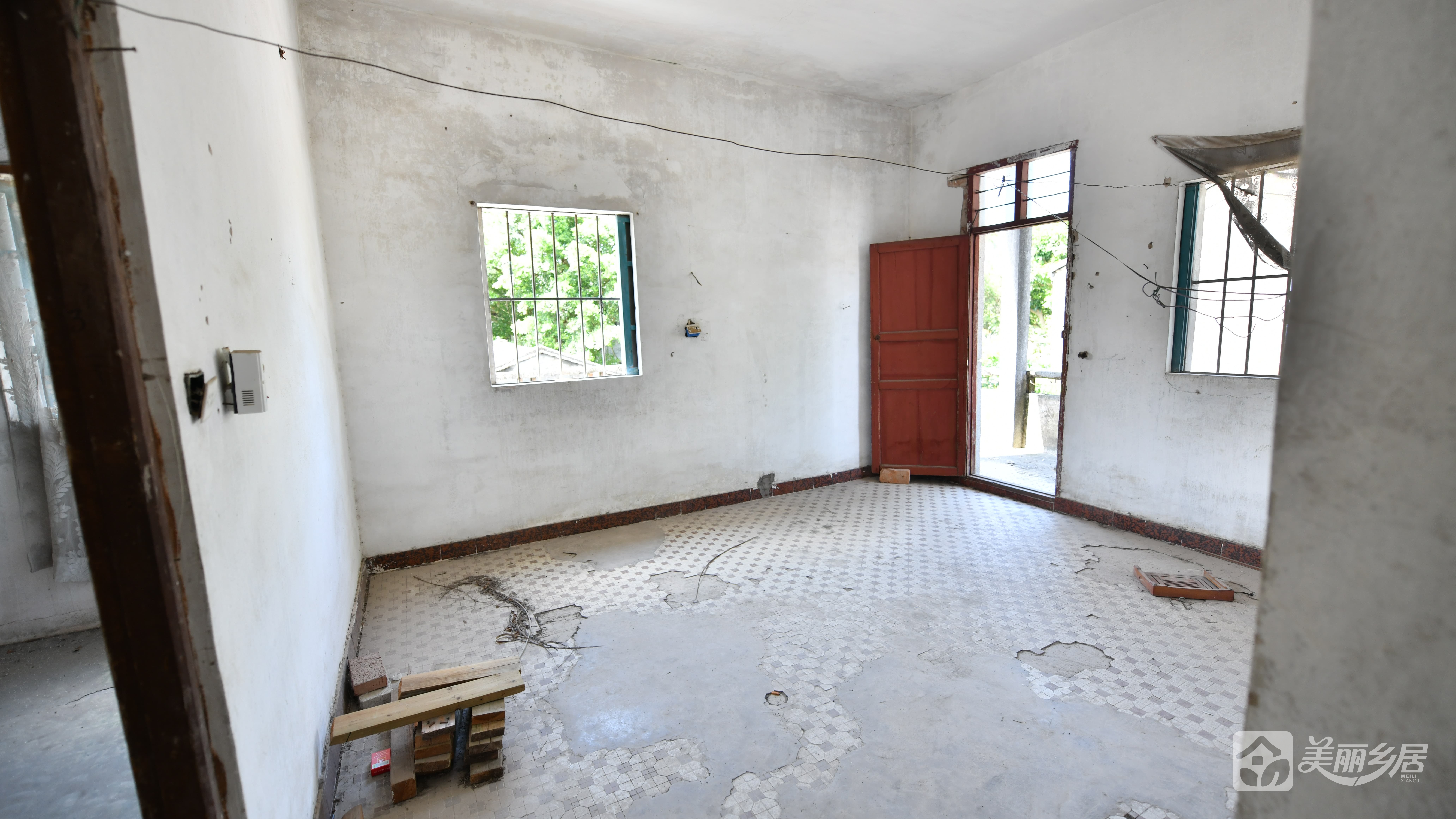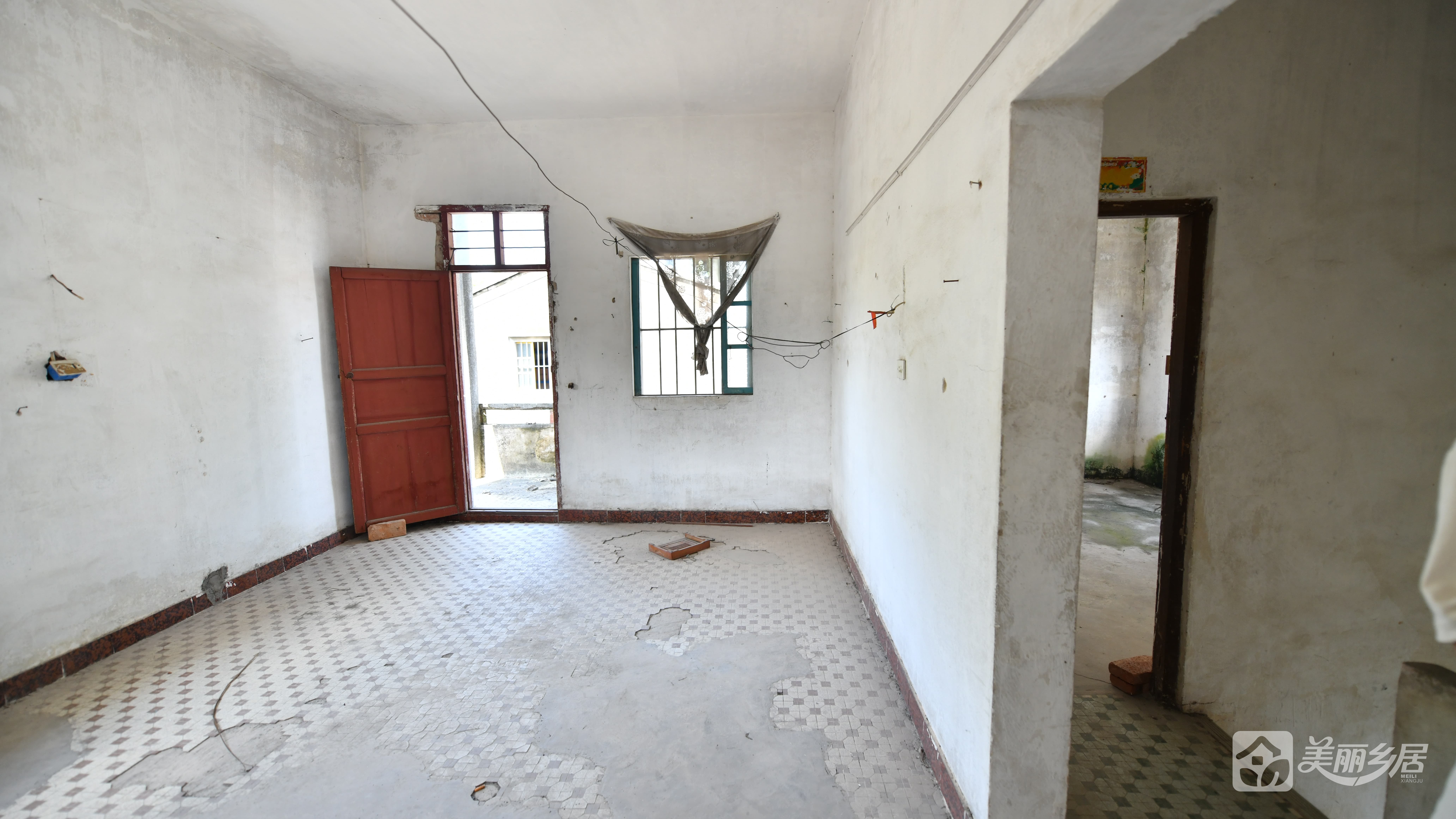 - 设施:门内左侧有一扇带铁栅栏窗户,窗框金属材质;屋内可见简易长凳、旧插座及开关装置(。