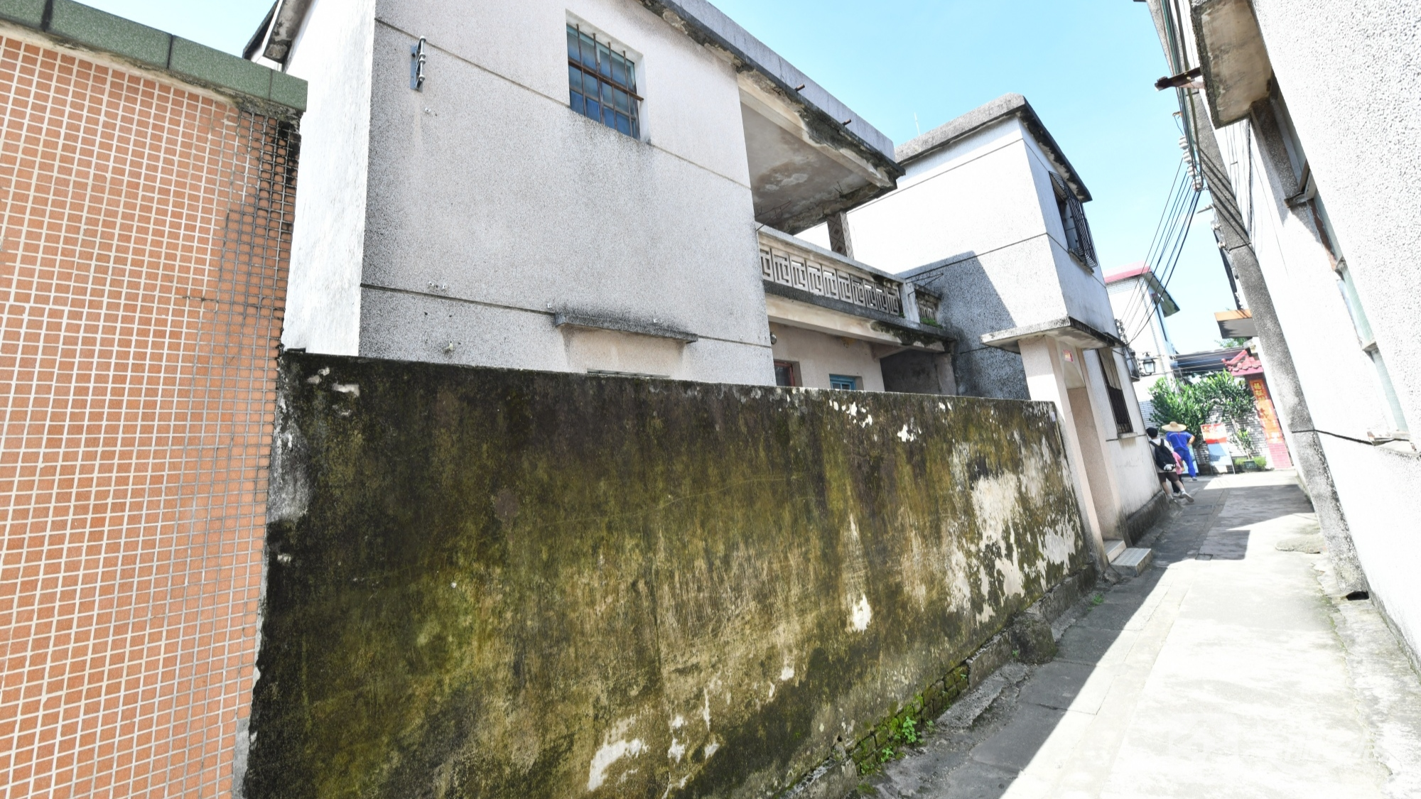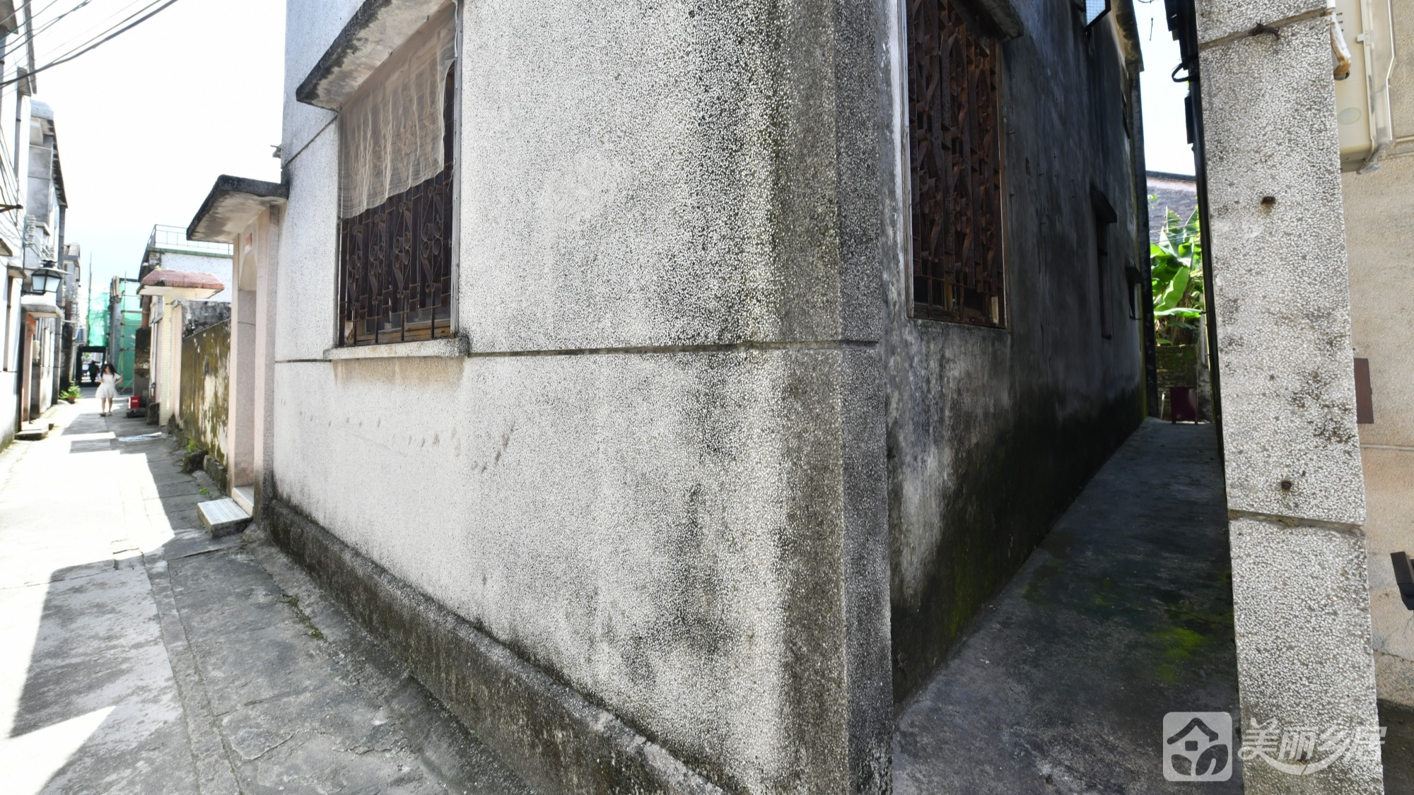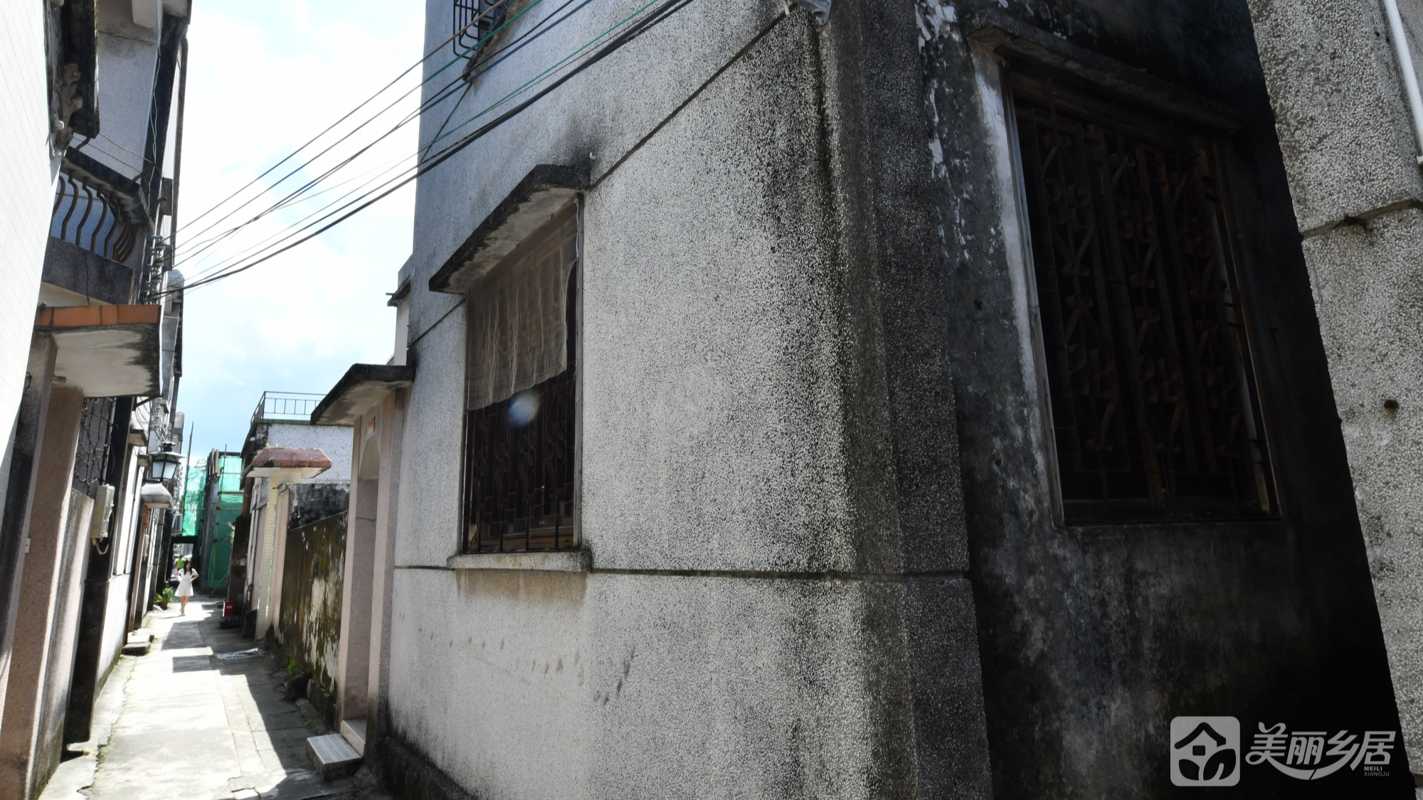 楼房与周边相似的老旧建筑共同构成怀旧感十足的巷弄场景。尽管环境寂静,但偶见的行人、墙角绿植及门楣对联,仍为其增添了微弱的生活温度,仿佛在诉说着过往的烟火故事。