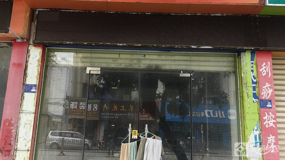中山市火炬开发区张家边四村板埔路北侧商业街第10卡商铺招租,玻璃门面,显眼招租横幅。