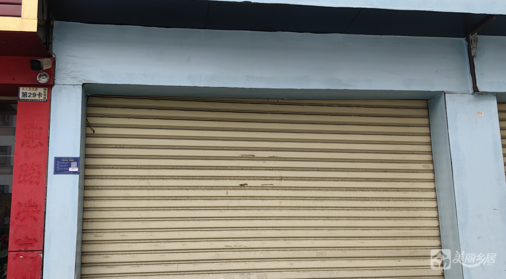 中山市火炬开发区张家边四村板埔路北侧商业街第27卡商铺,浅蓝外墙,卷帘门闭合,墙面有“铺位招租”“达人”字样,现空置待租。
