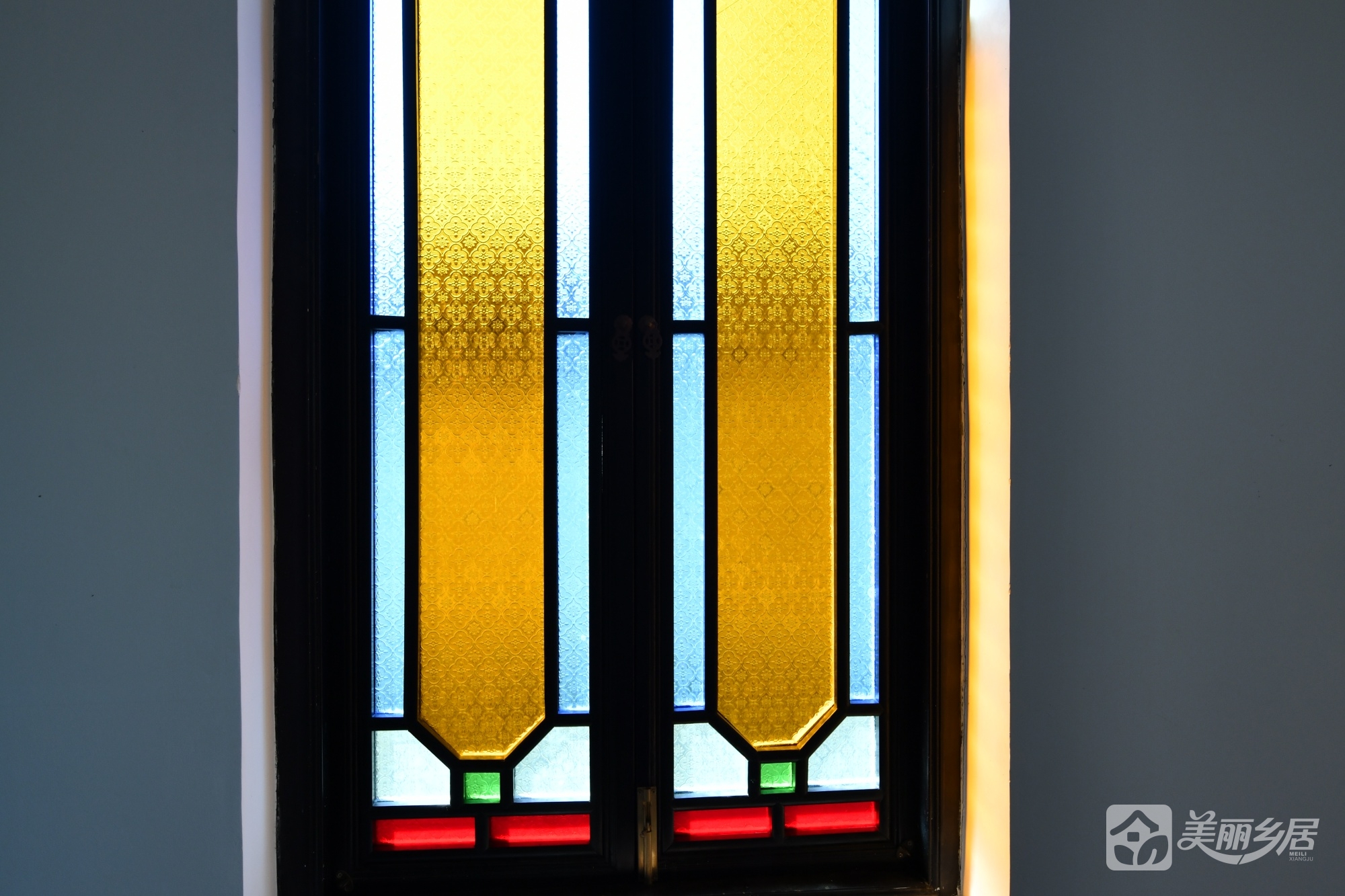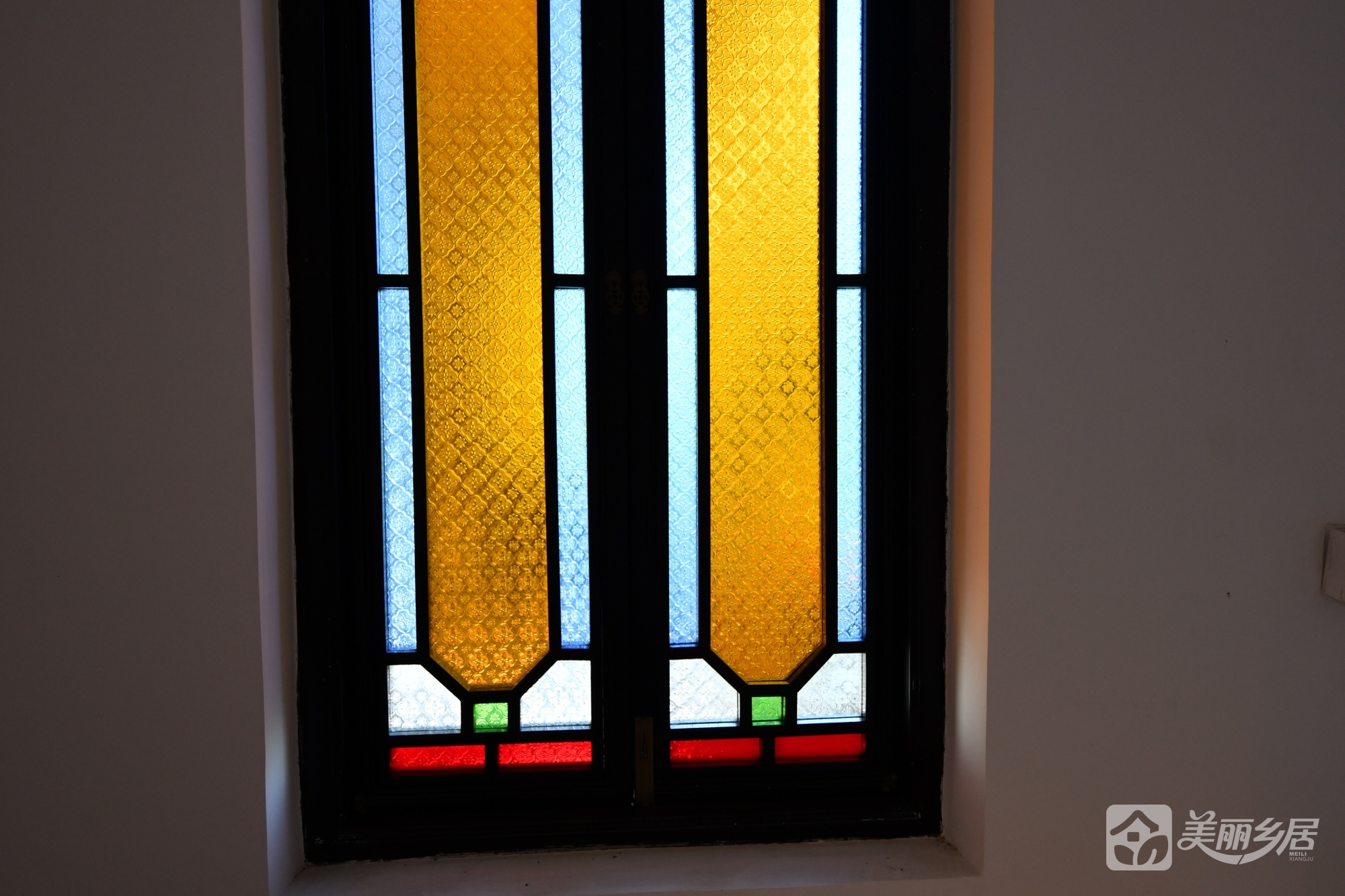- 嵌入白色墙体,黑色窗框简洁利落;主体为两块橙黄色玻璃(带细密纹理),两侧各配蓝色竖条玻璃,边缘点缀红、绿、白等色小块玻璃,色彩搭配和谐。自然光穿透时,室内光线柔和且富有层次,凸显古建筑独特韵味。