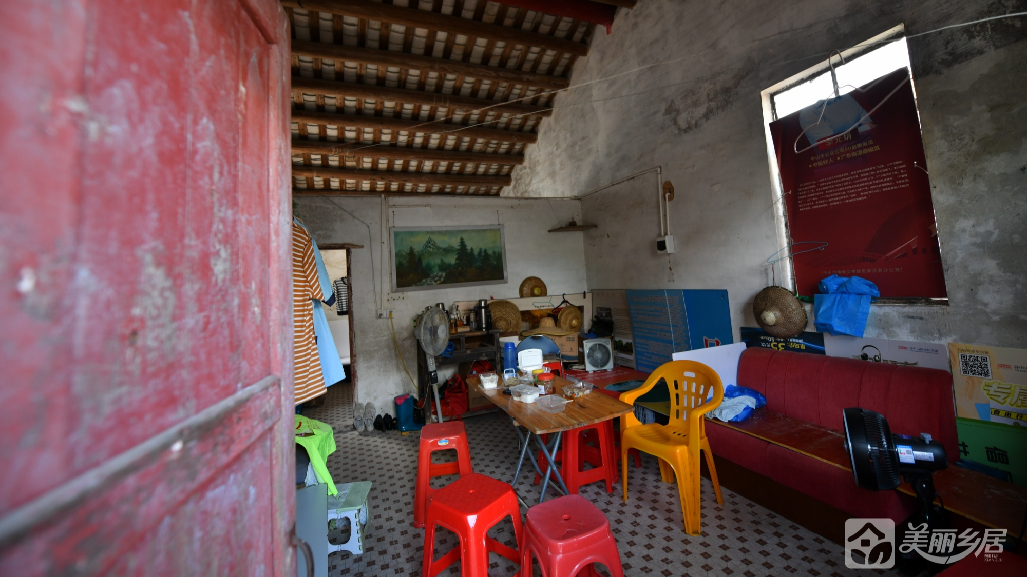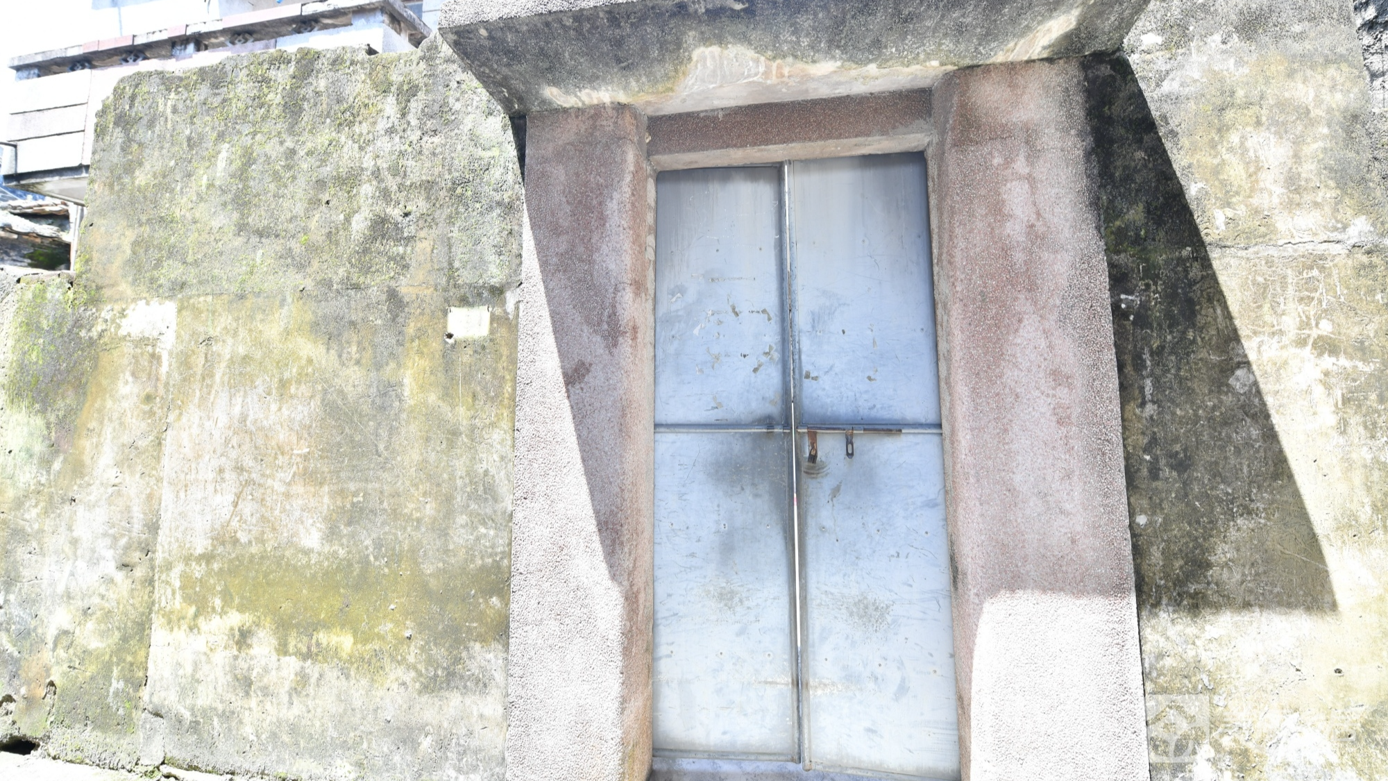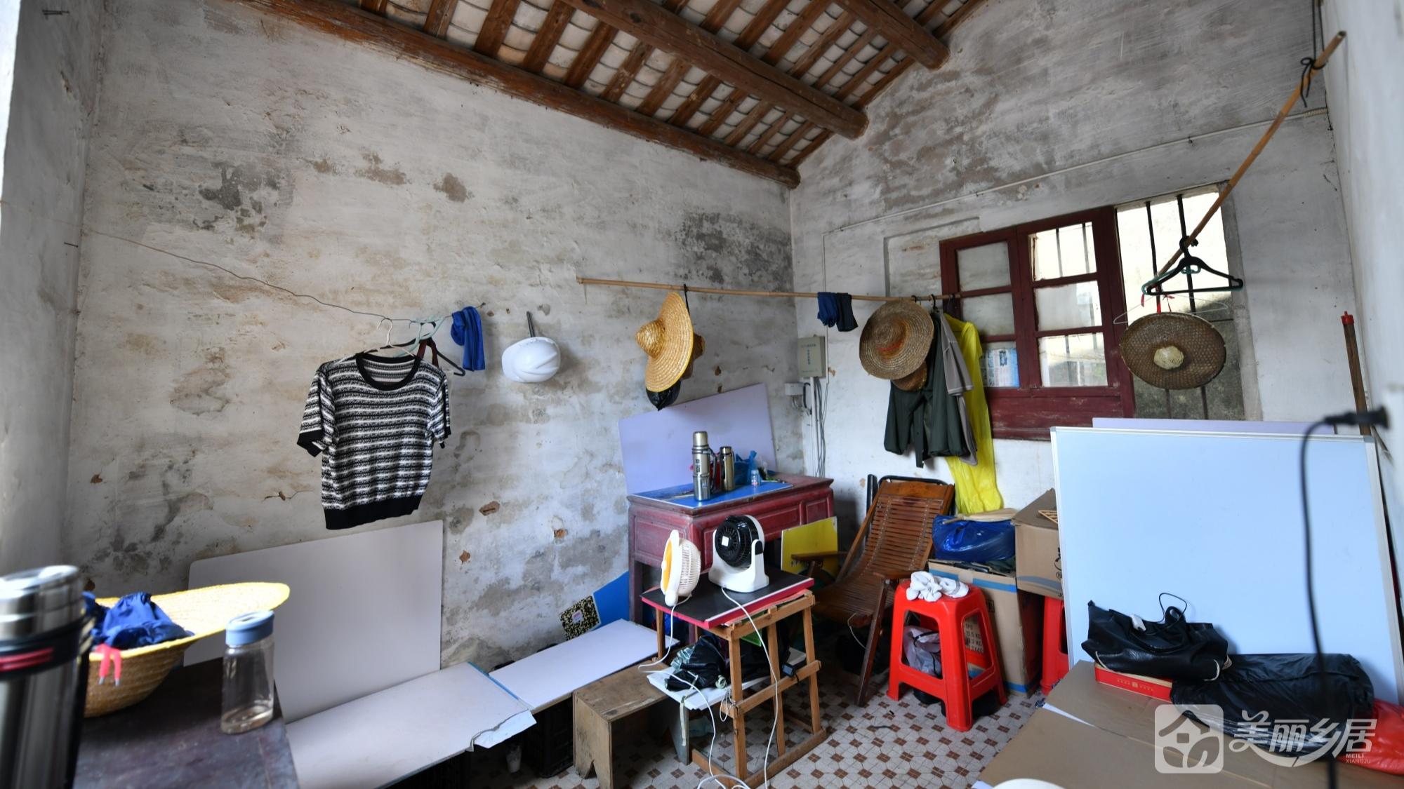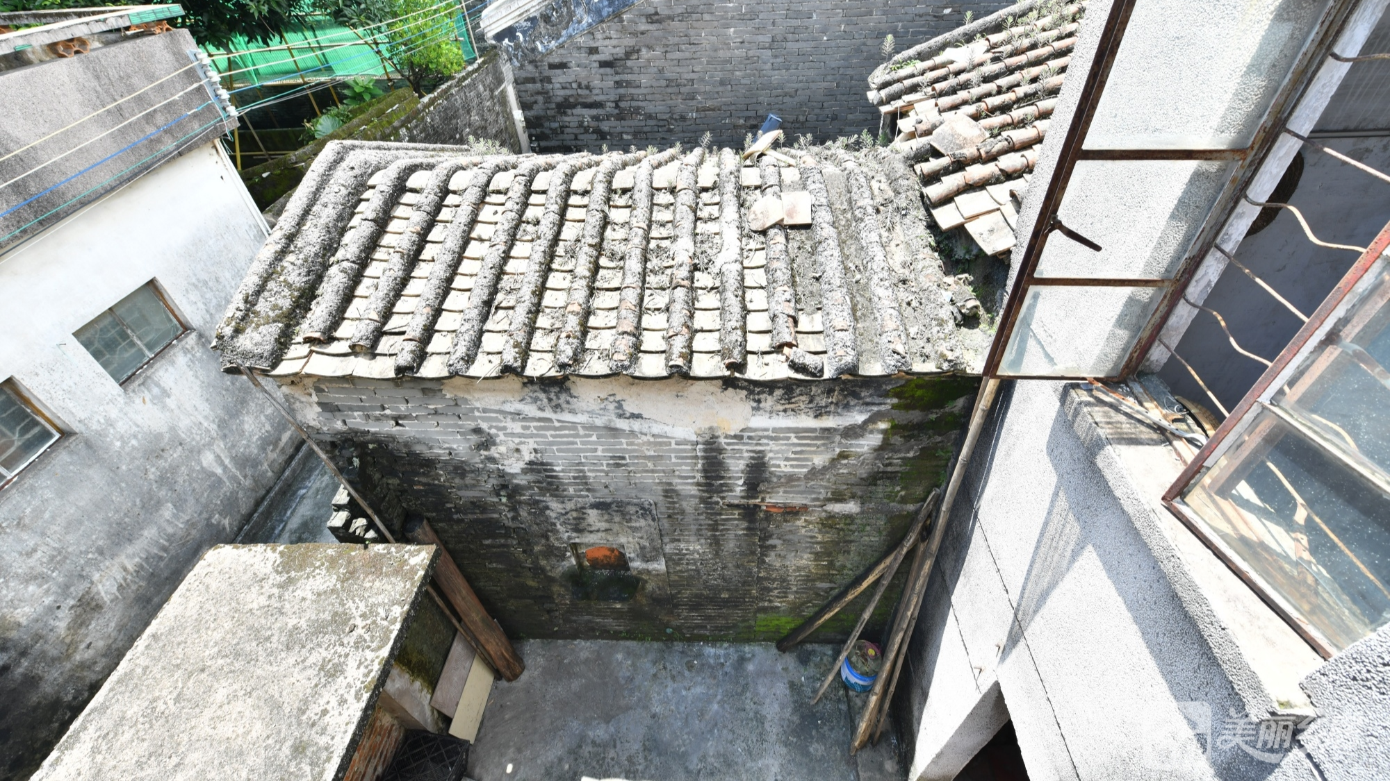 l 部分区域屋顶为木梁+瓦片结构,墙面灰白有污渍;窗户装有铁栅栏。