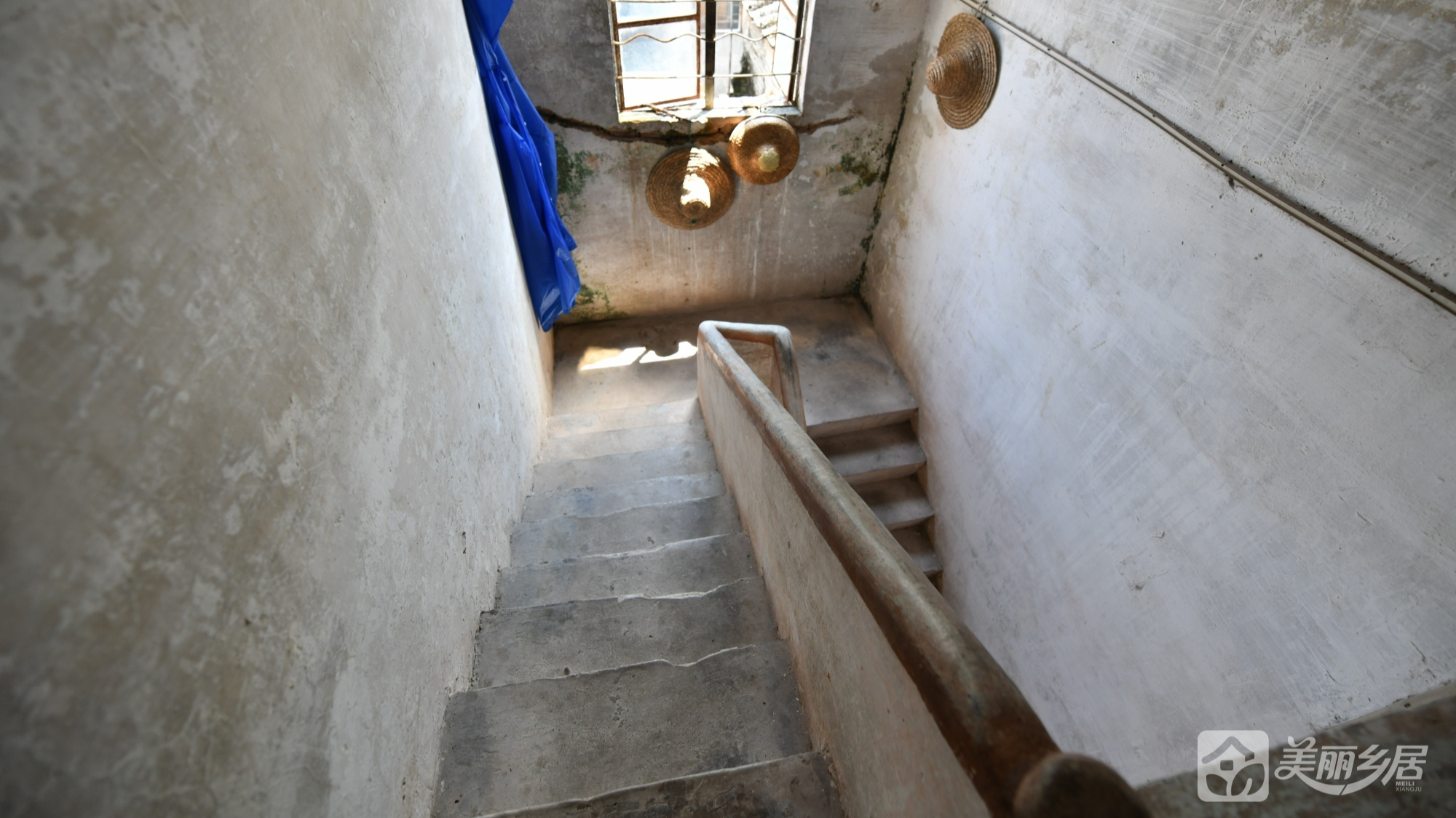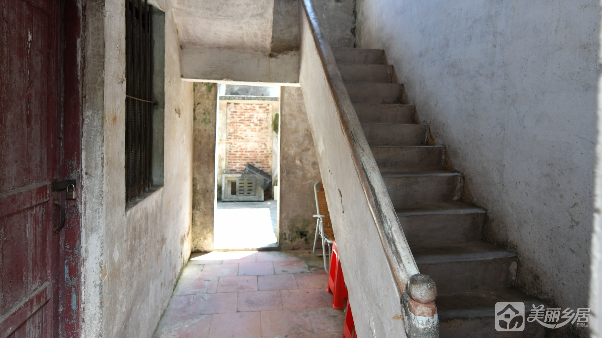 l 楼梯结构:楼梯为混凝土材质,右侧设浅色木质扶手,左侧为白色石灰墙,局部斑驳脱落,墙面上开有一扇深红色旧木门,旁设一扇带黑色铁栏杆的小窗。
