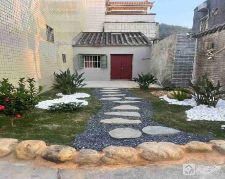 古鹤村下街22号现出租一栋23.76㎡的独立住宅。建筑外墙饰以米黄色瓷砖,配传统中式红色实木双开门,庄重典雅。房屋自带一方形小院,院中深灰色碎石小径点缀鹅卵石,两侧对称种植绿植与白色花卉,原石垒砌边界更显自然意趣。周边毗邻传统青砖民居与现代建筑,远眺可见山林轮廓,环境清幽私密。整体布局对称和谐,色彩温润,兼具传统韵味与舒适宁静,适合追求文化氛围与自然生活的租客。