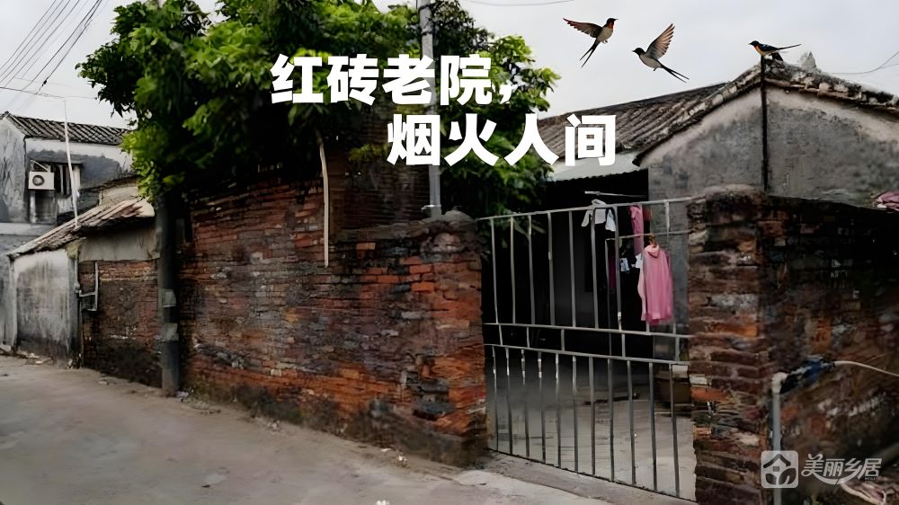 为带庭院的老旧民居,红砖墙体斑驳沧桑,部分砖块裸露,尽显岁月痕迹;庭院设铁栅栏门,摆放着绿植盆栽,充满生活气息;建筑屋顶样式古朴,周边电线交错、绿树掩映,整体既透着时光打磨的陈旧感,又因烟火气显得鲜活。