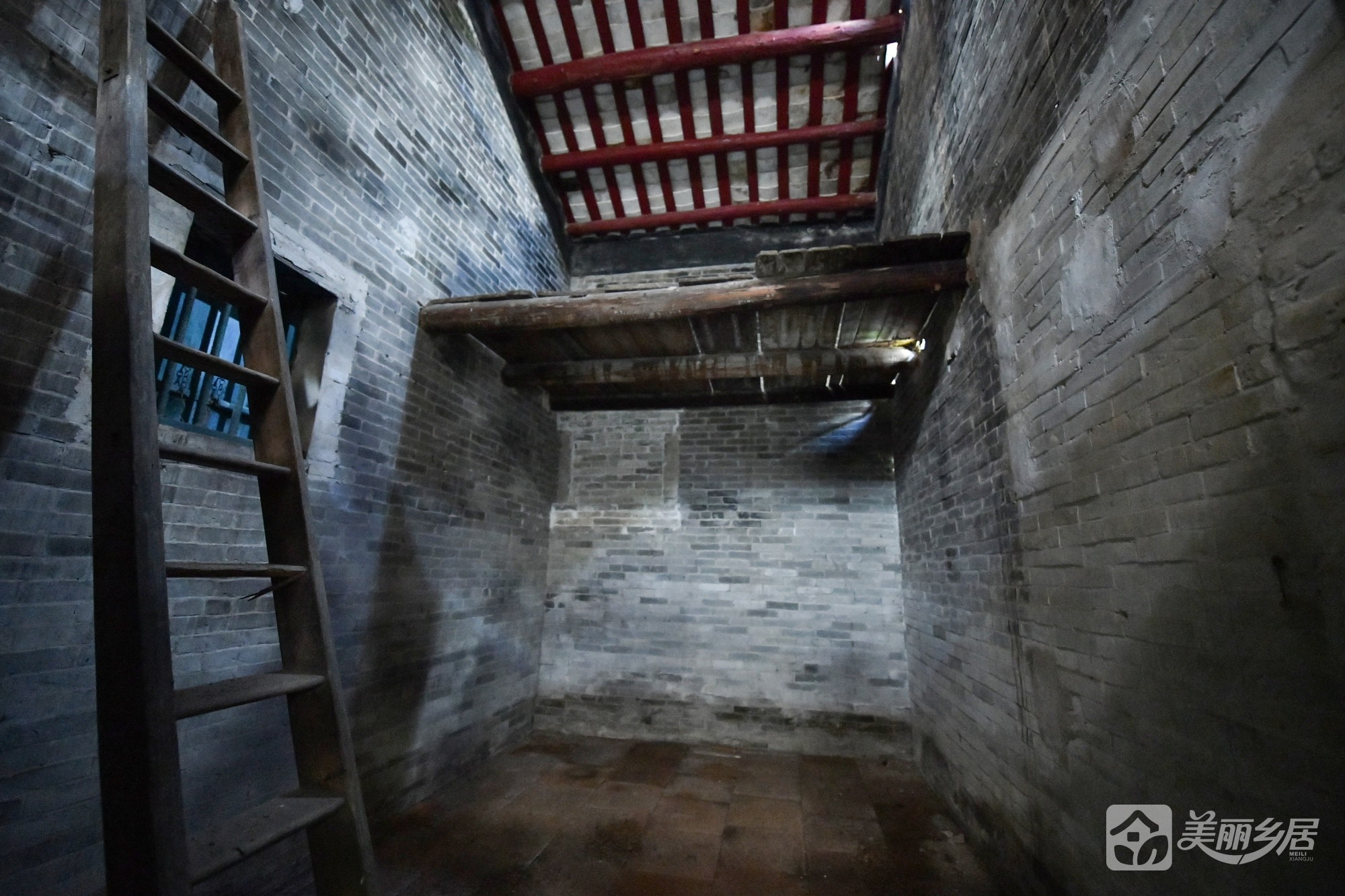 - 室内设有木质梯子(通向屋顶夹层),屋顶可见红棕色木梁(排列有序,镂空设计),与灰瓦屋顶形成传统建筑结构;墙面另有一扇带铁栅栏的小窗(与院落小窗风格统一),增强空间通透感。