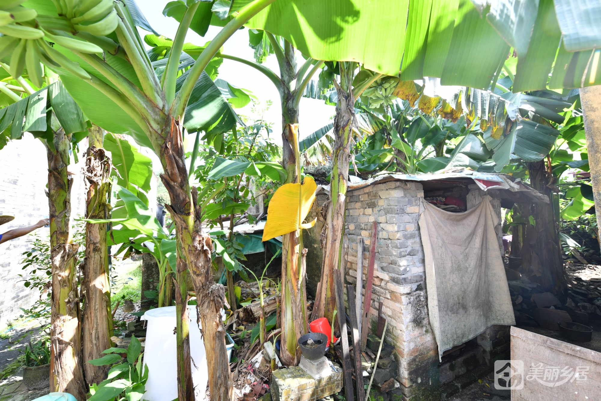 - 房屋周边环绕高大香蕉树,树下绿植丛生;远处可见传统民居与古巷,自然与人文环境交融,符合古村保护与文旅开发需求。