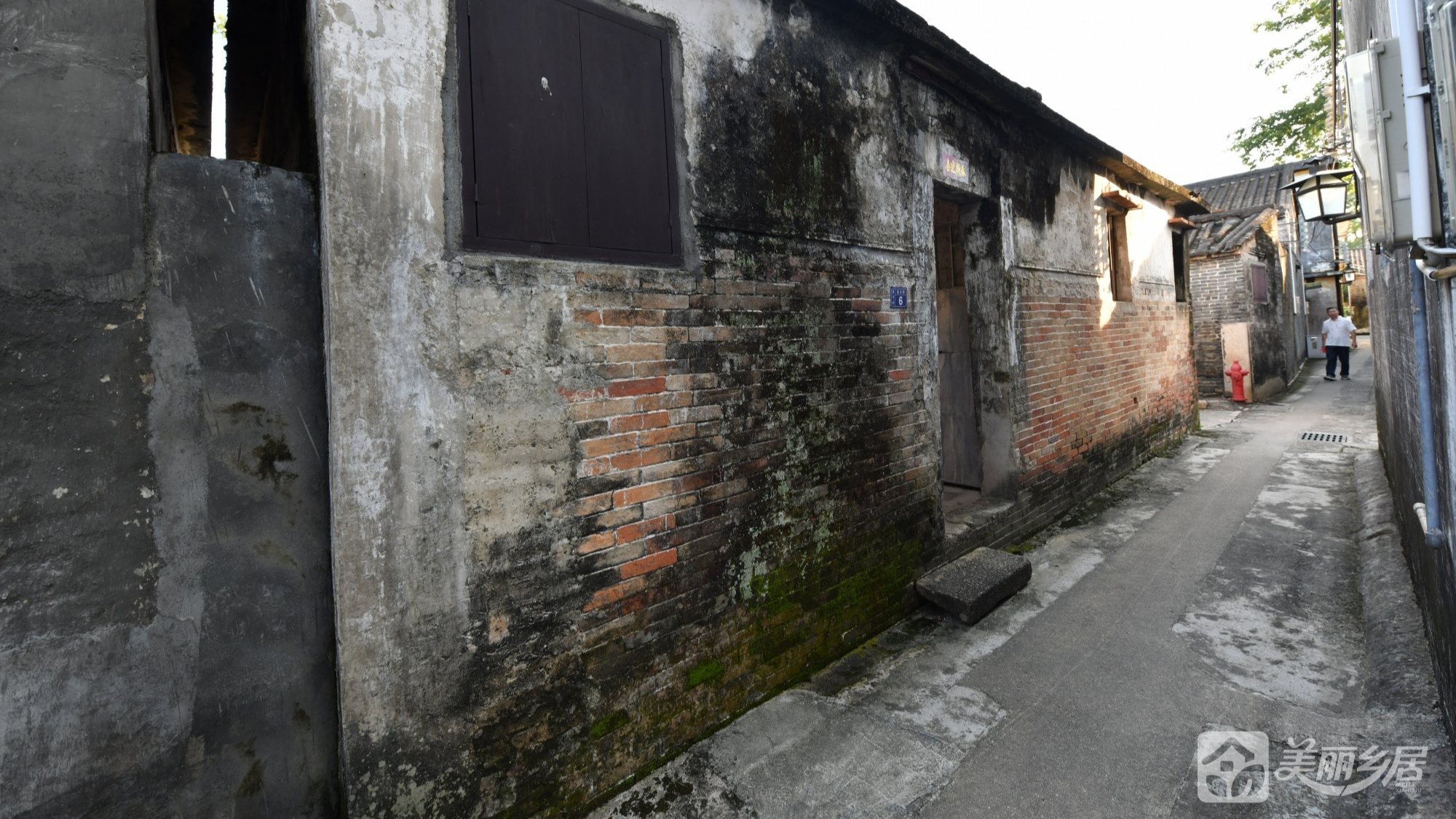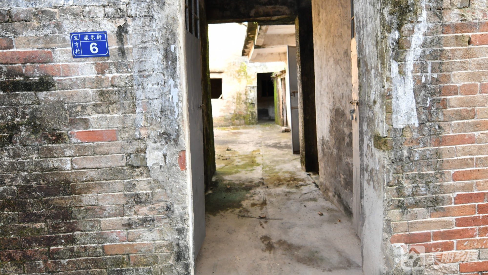 l 入口处左侧墙面嵌有蓝底门牌,清晰标注“翠亨村 康乐街 6”,墙面为红砖砌筑。