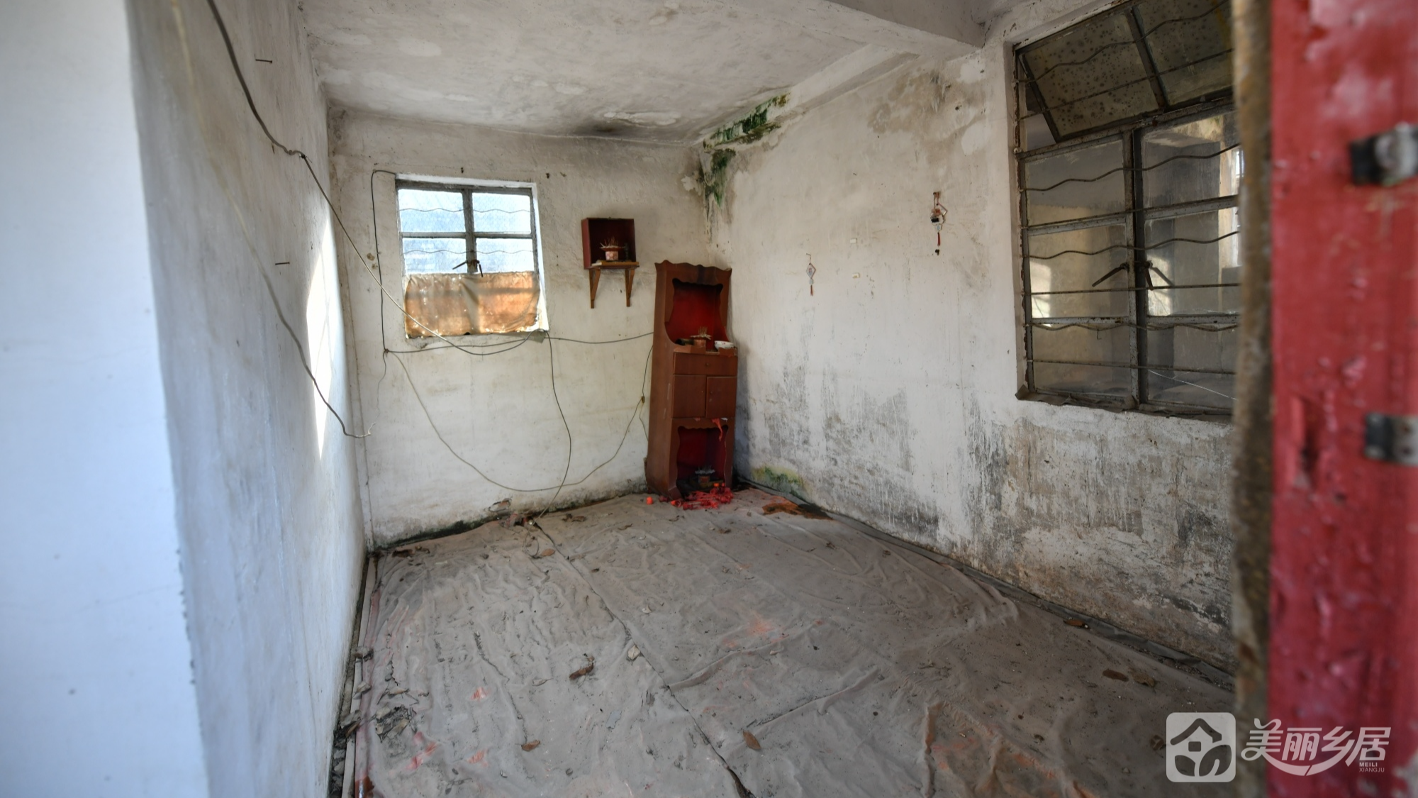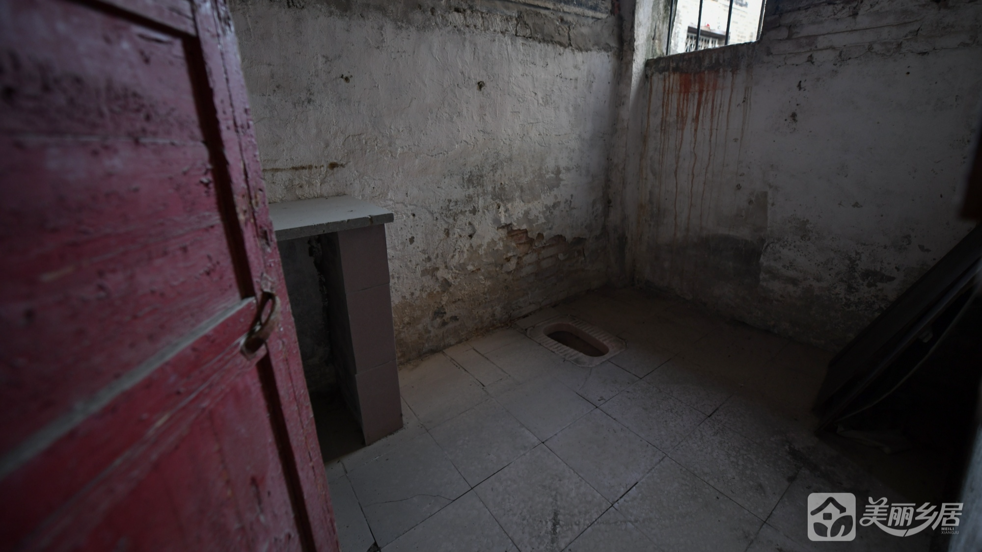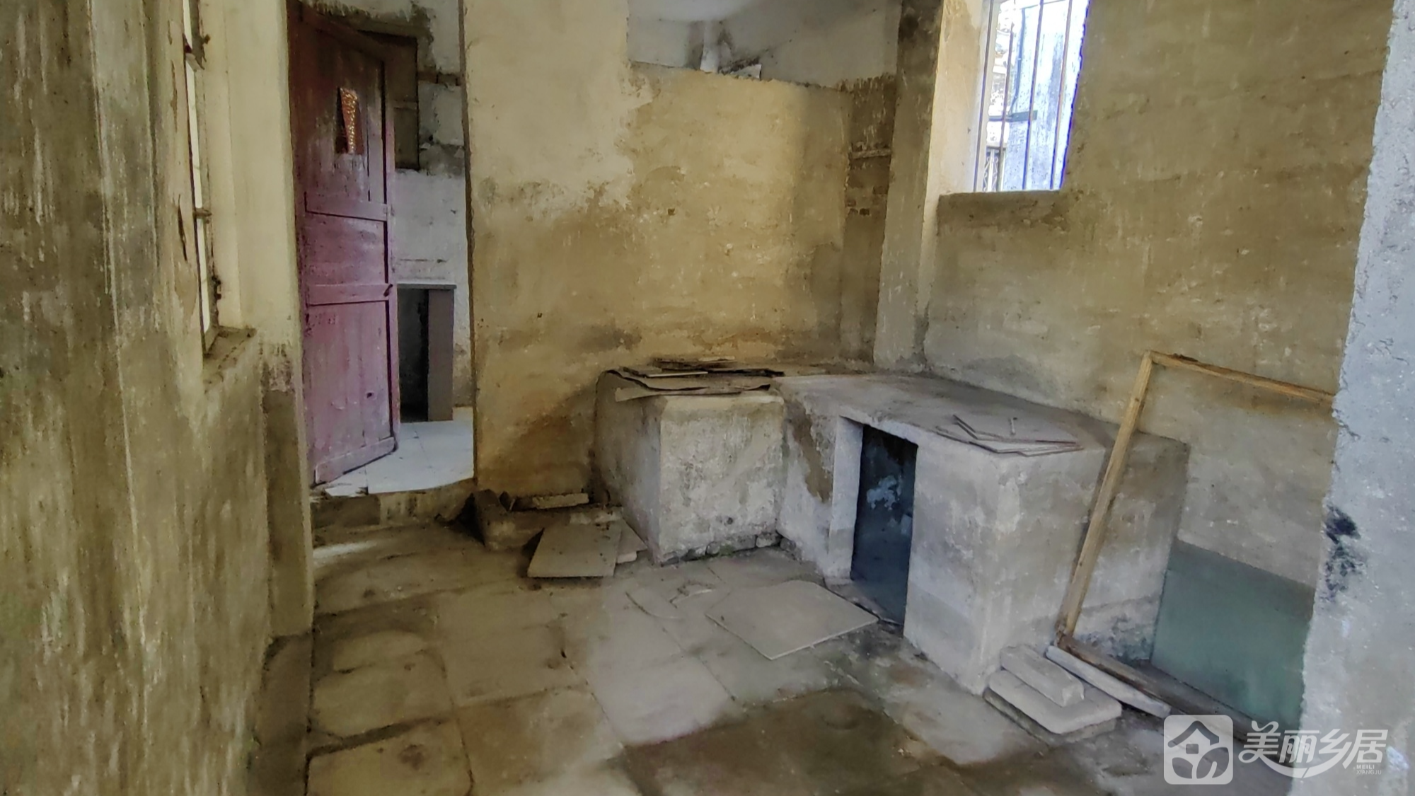 l 主屋区域:墙面以水泥为主,地面为方形石板铺设。右侧设一扇带铁栏杆的窗户;窗下有一水泥简易台面。左侧有一扇暗红色木门,门外连通其他功能区。