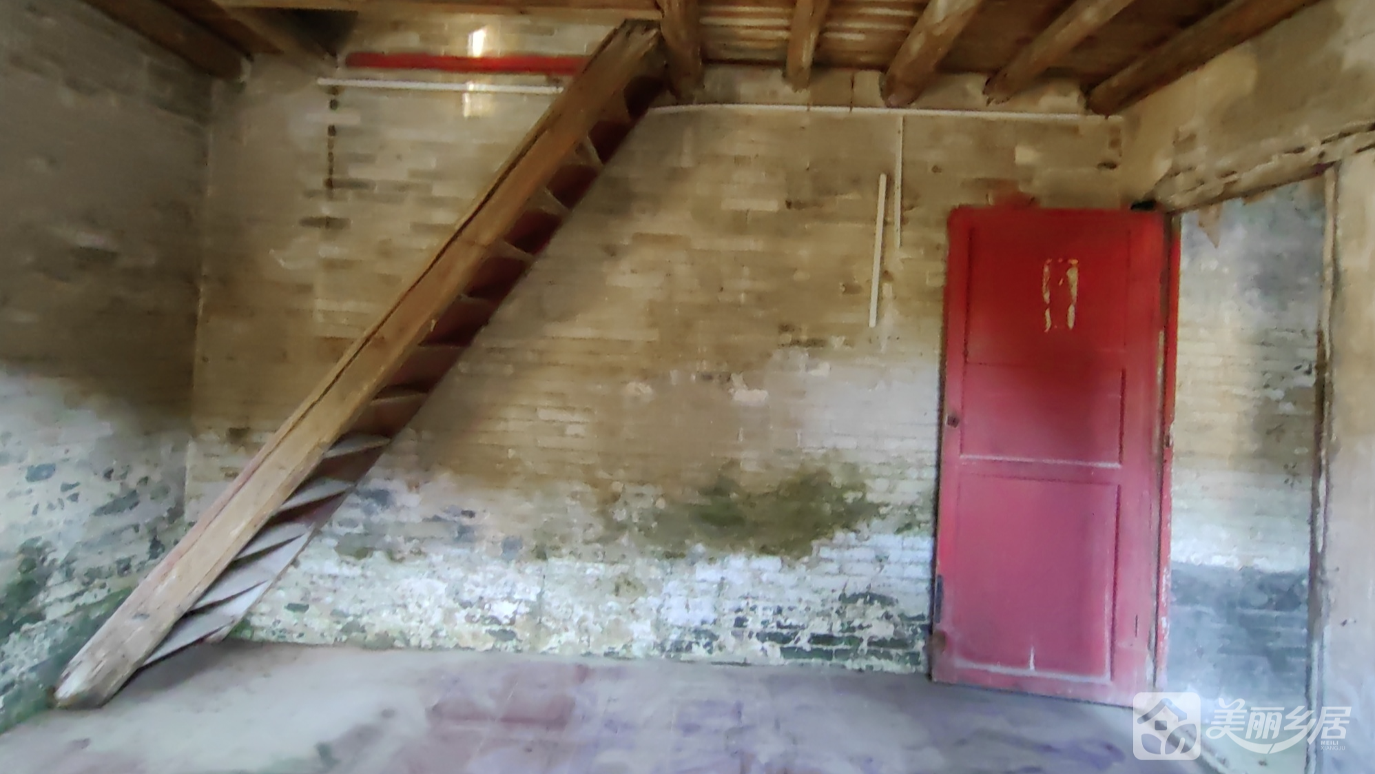l 阁楼区域墙面为土黄色砖墙,左侧斜放一架木质楼梯。