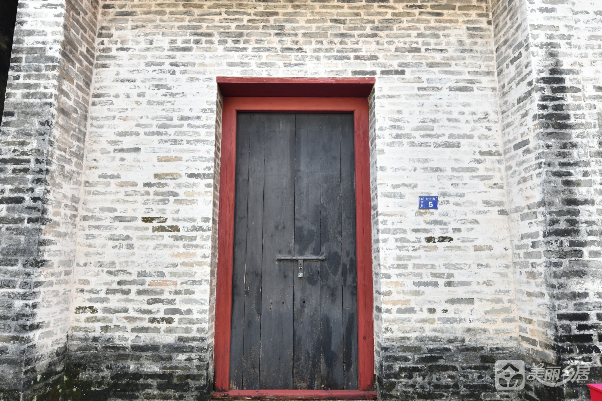 - 正门前设几级水泥台阶,台阶旁立红色指示牌及红色灭火器;门前为石板小巷,地面整洁,两侧为老旧民居,环境静谧;房屋一侧设蓝色护栏,另一侧紧邻其他传统建筑,整体融入古村街巷肌理。