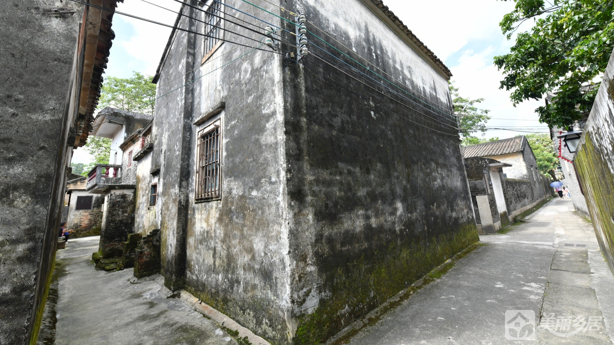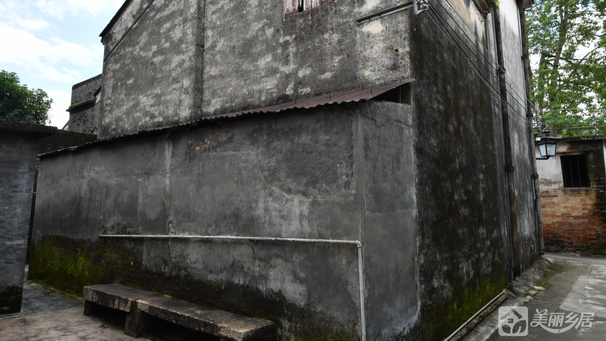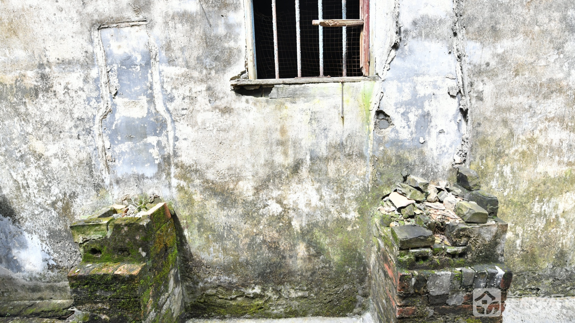 房屋整体保留原始乡村建筑肌理,外墙以灰白/灰黑色砖块砌成;多扇木质窗配铁栅栏;侧面设波纹铁皮屋檐;周边为窄巷水泥地,邻老旧建筑与绿植,烟火气与自然生机交融。