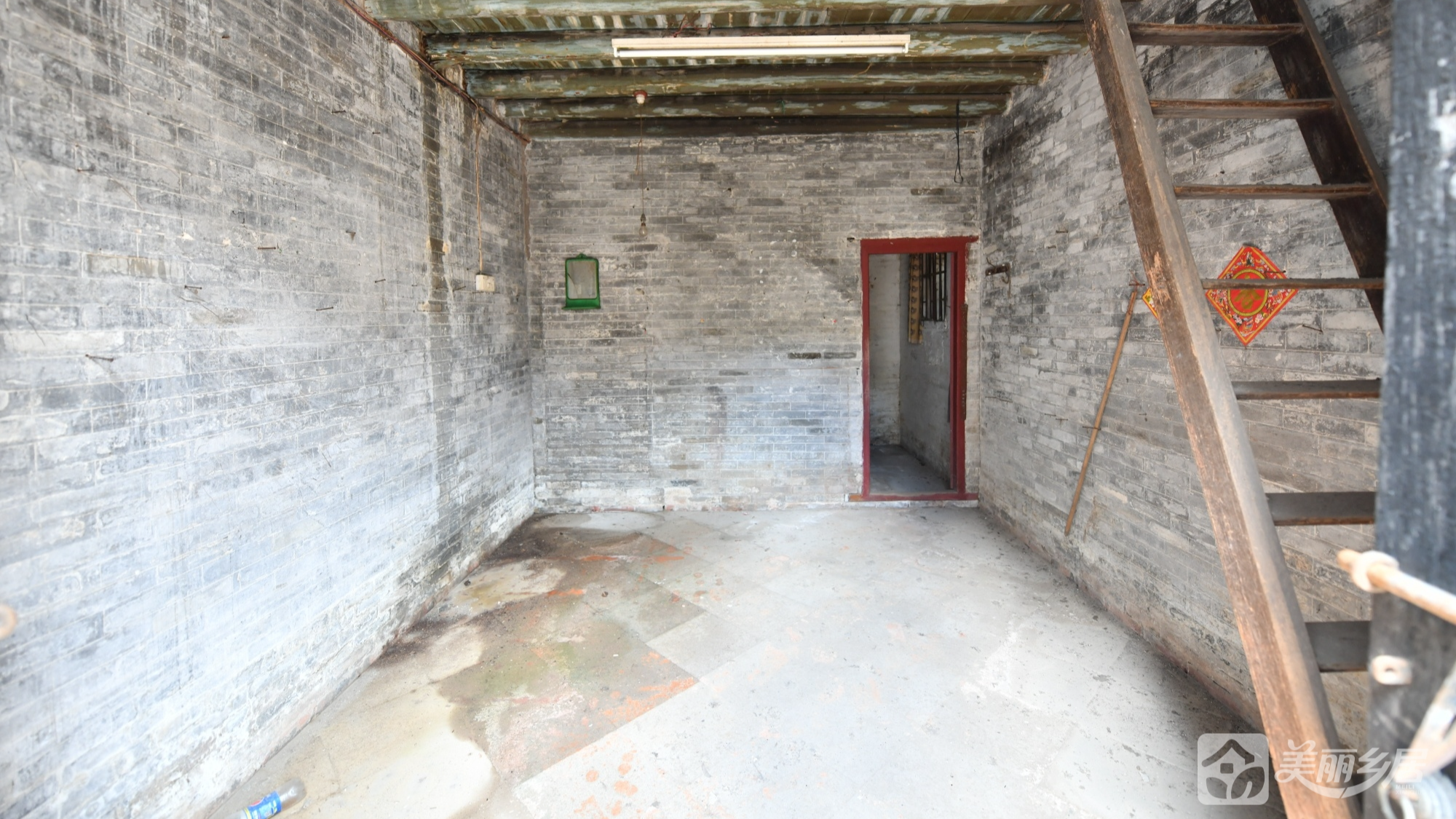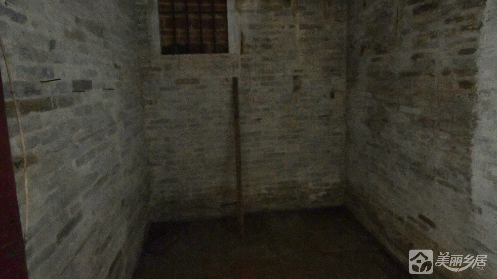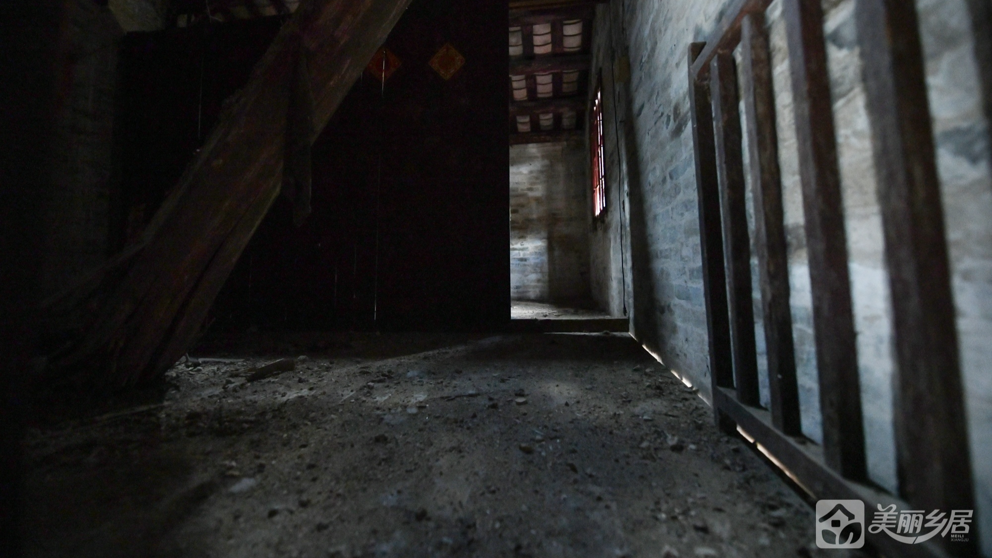 屋内为闲置状态,保留原始结构——木质横梁天花板、水泥地面、方形小窗(棕红铁栅栏)、倾斜木质梁等细节,传统生活痕迹与岁月感交织。