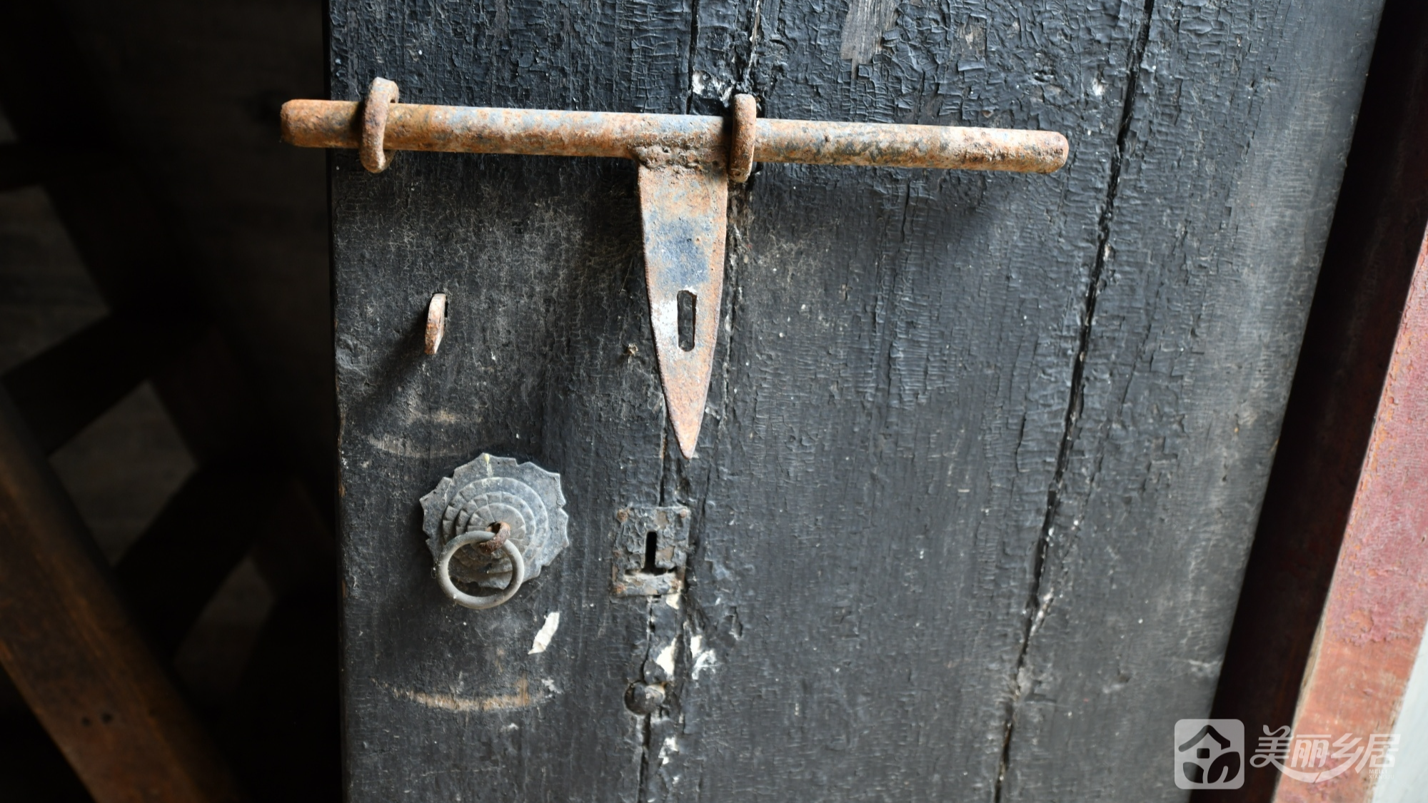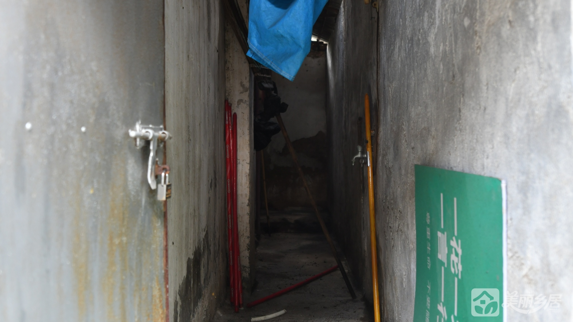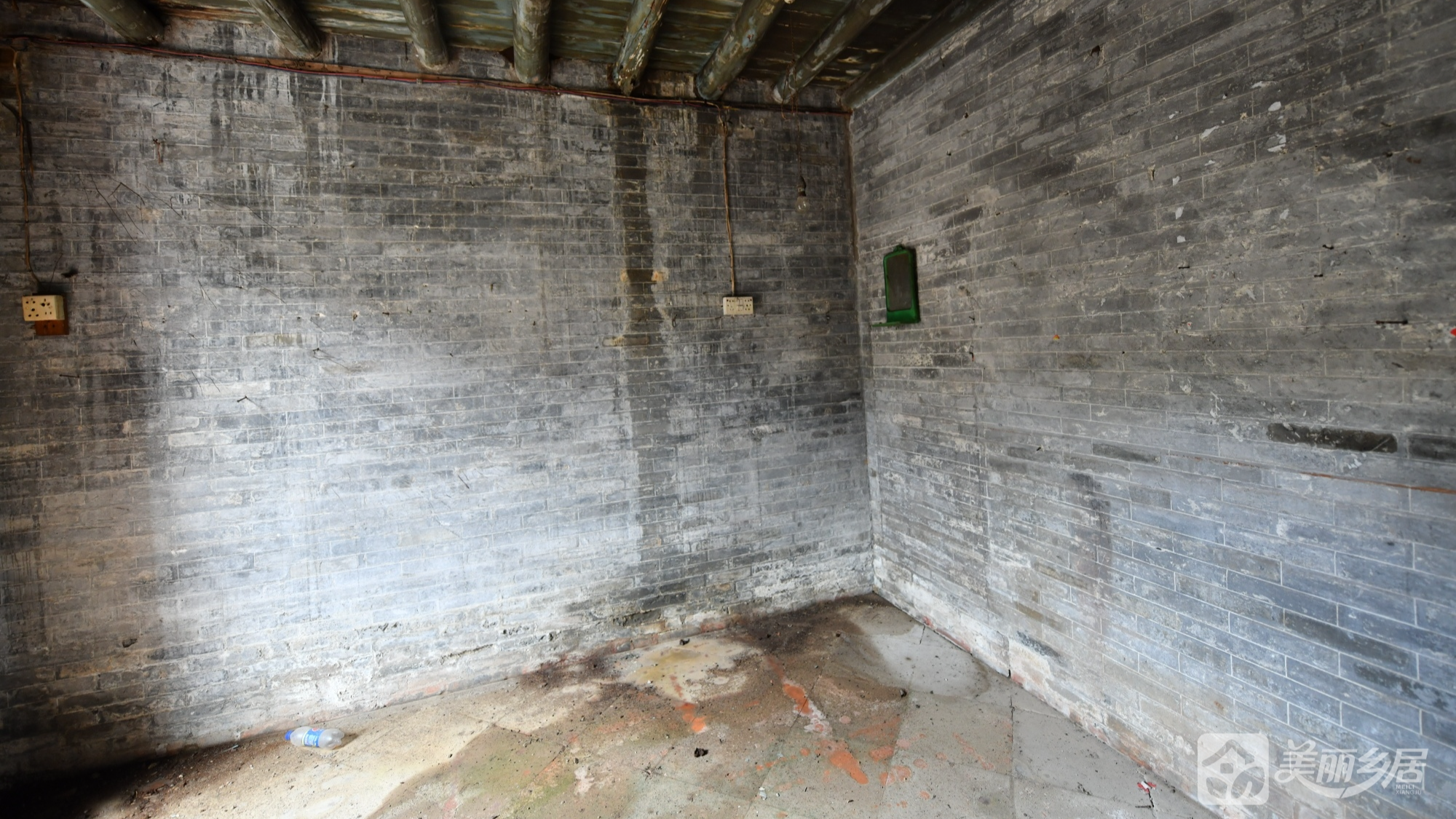 屋内为闲置状态,保留原始结构——木质横梁天花板、水泥地面、方形小窗(棕红铁栅栏)、倾斜木质梁等细节,传统生活痕迹与岁月感交织。