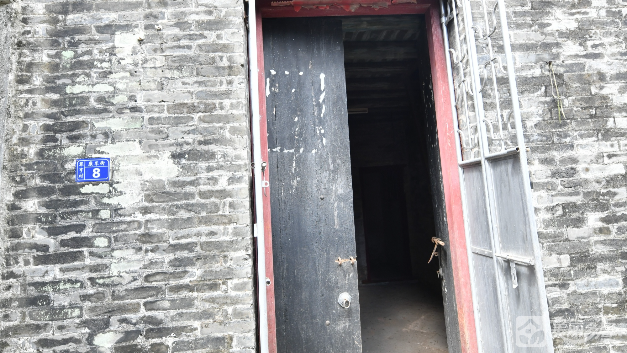 正门为黑色木门,配红色门框,右侧铁栅栏门敞开便利通行;门左侧挂蓝色门牌“康乐街8号”,标识清晰。