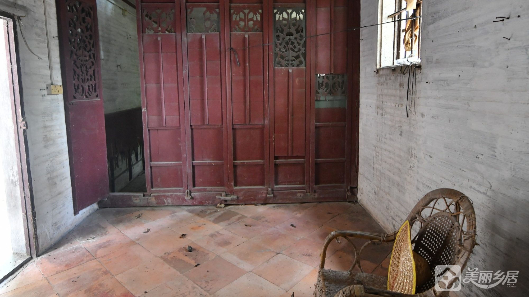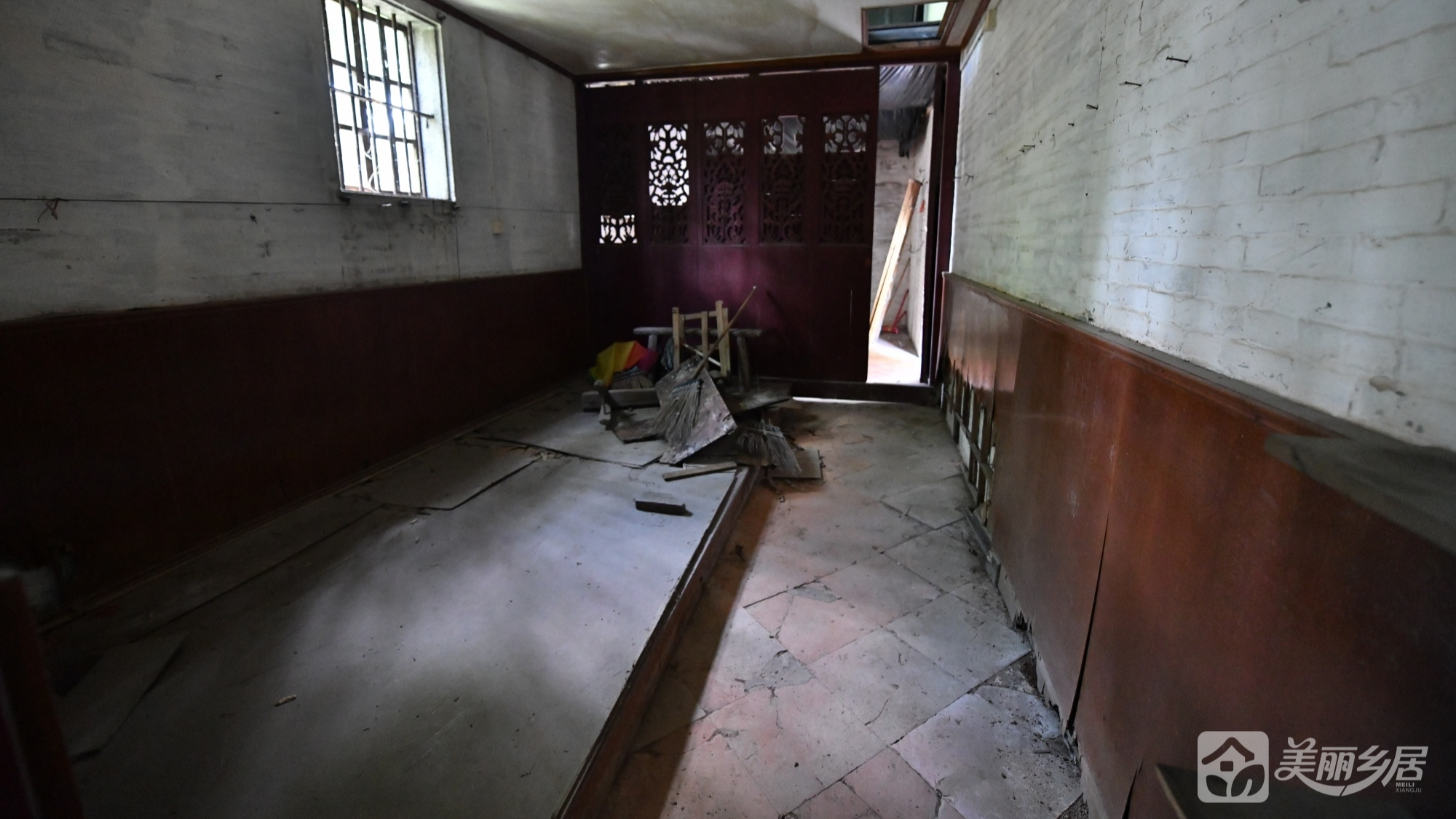l 雕花木门房间:独立房间设红褐色镂空雕花木门,门体木质坚硬;门左侧为红褐色瓷砖地面,右侧配木质窗户,整体风格古朴典雅。