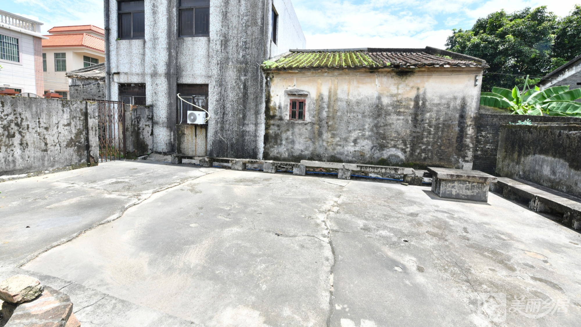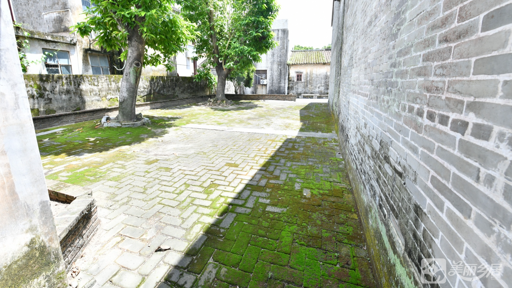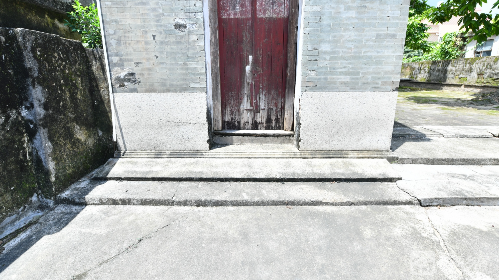 l 绿化与氛围:建筑右侧及后方环绕低矮绿植,枝叶繁茂,树下生长的杂草与青苔增添自然野趣。
