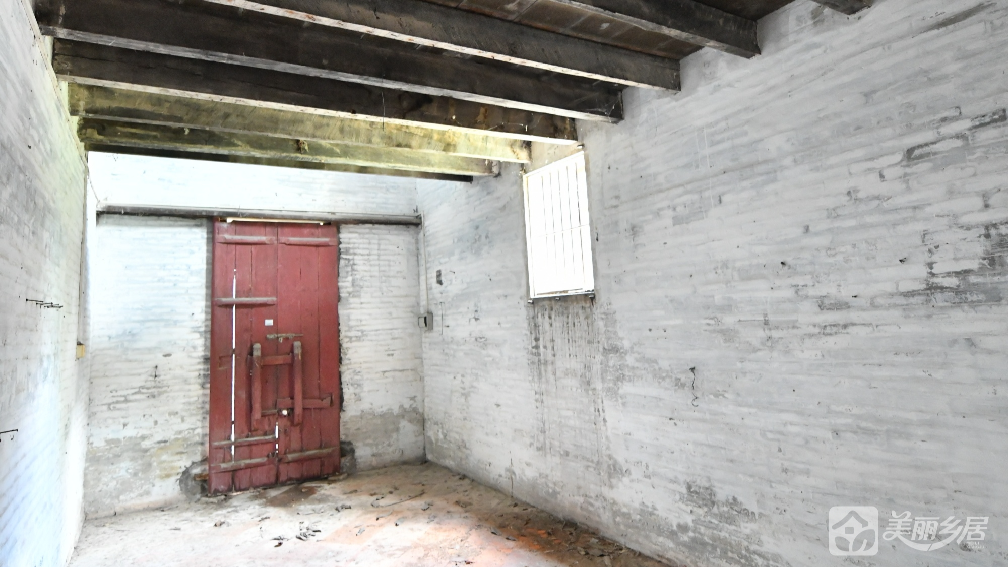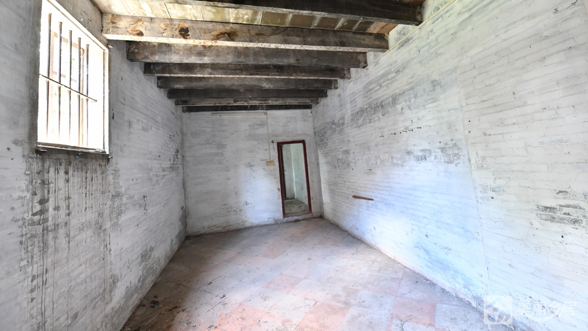 l 墙面与地面:主房间墙面下半部分为红褐色,上半部分为灰白色砖墙;天花板以深色木质横梁支撑,梁体粗壮,可见原始建筑承重结构。地面多为方形红褐色瓷砖或水泥质地。