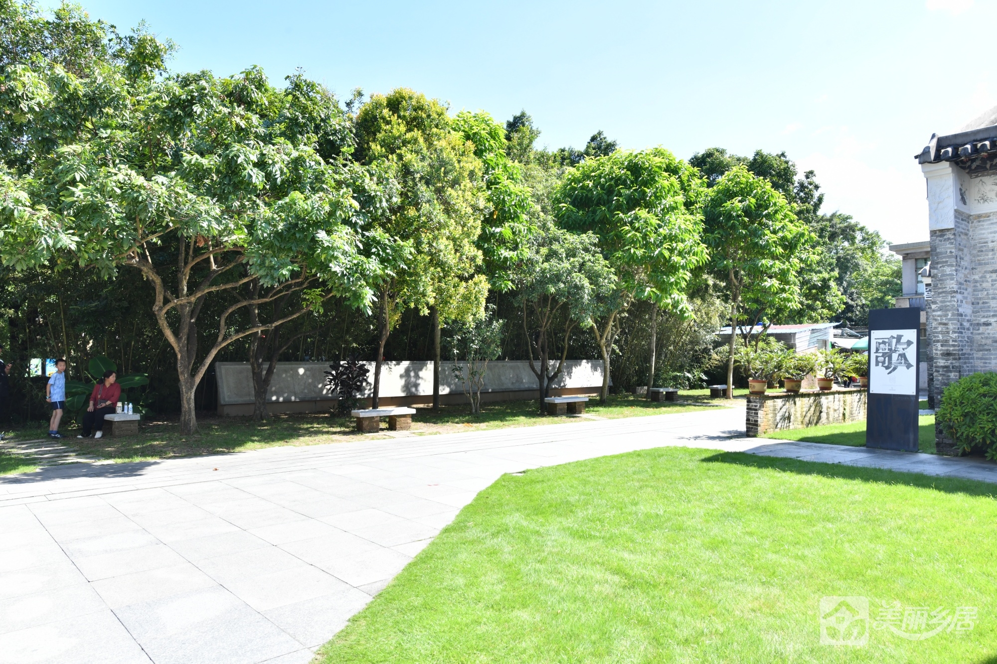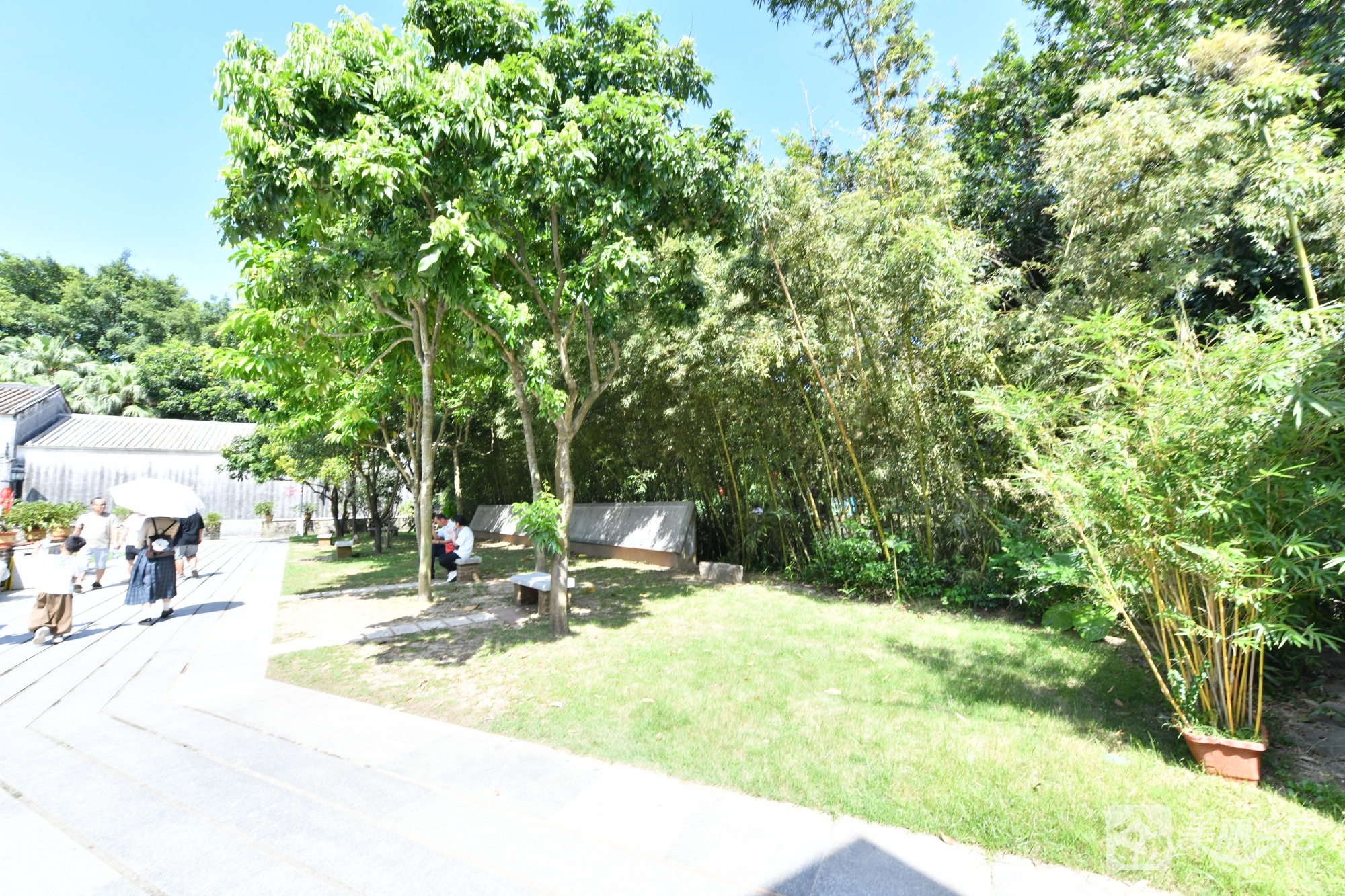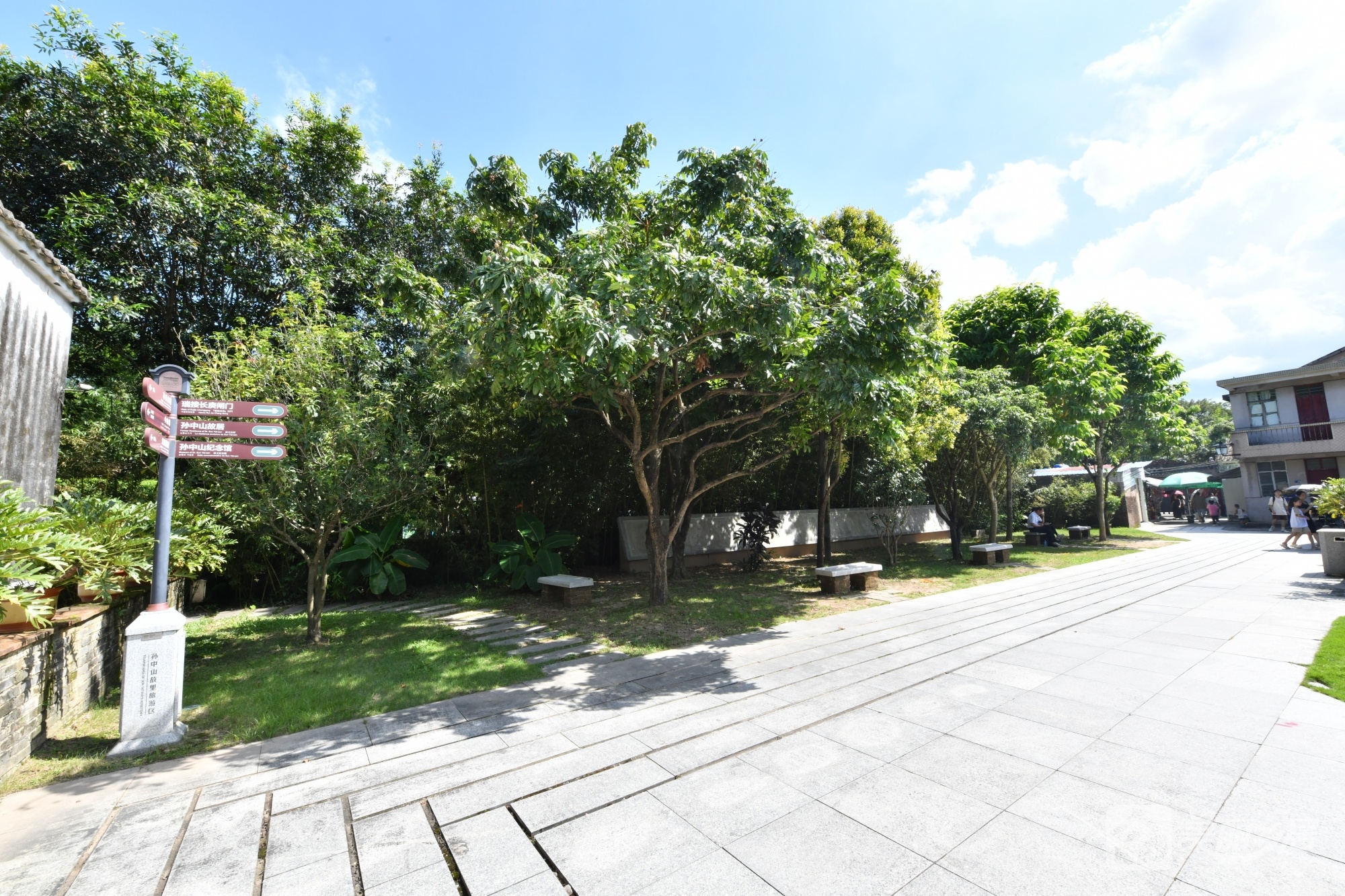 该农房原址位于翠亨村古建筑群核心区,2011年因非遗整治拆除,现为平整空地。现状以灰白色石板路为脉络,向四周延伸,左侧有棕红多向指示牌,黑色基座标方向;右侧草地翠绿,树木枝繁叶茂,边缘竹林挺拔。树下散置石凳,可见行人撑伞歇坐。灰色围墙后隐约露古建屋角,远处保留传统建筑轮廓。虽无屋舍,仍存行人往来、石凳闲坐的生活痕迹,成古村“留白”新景。