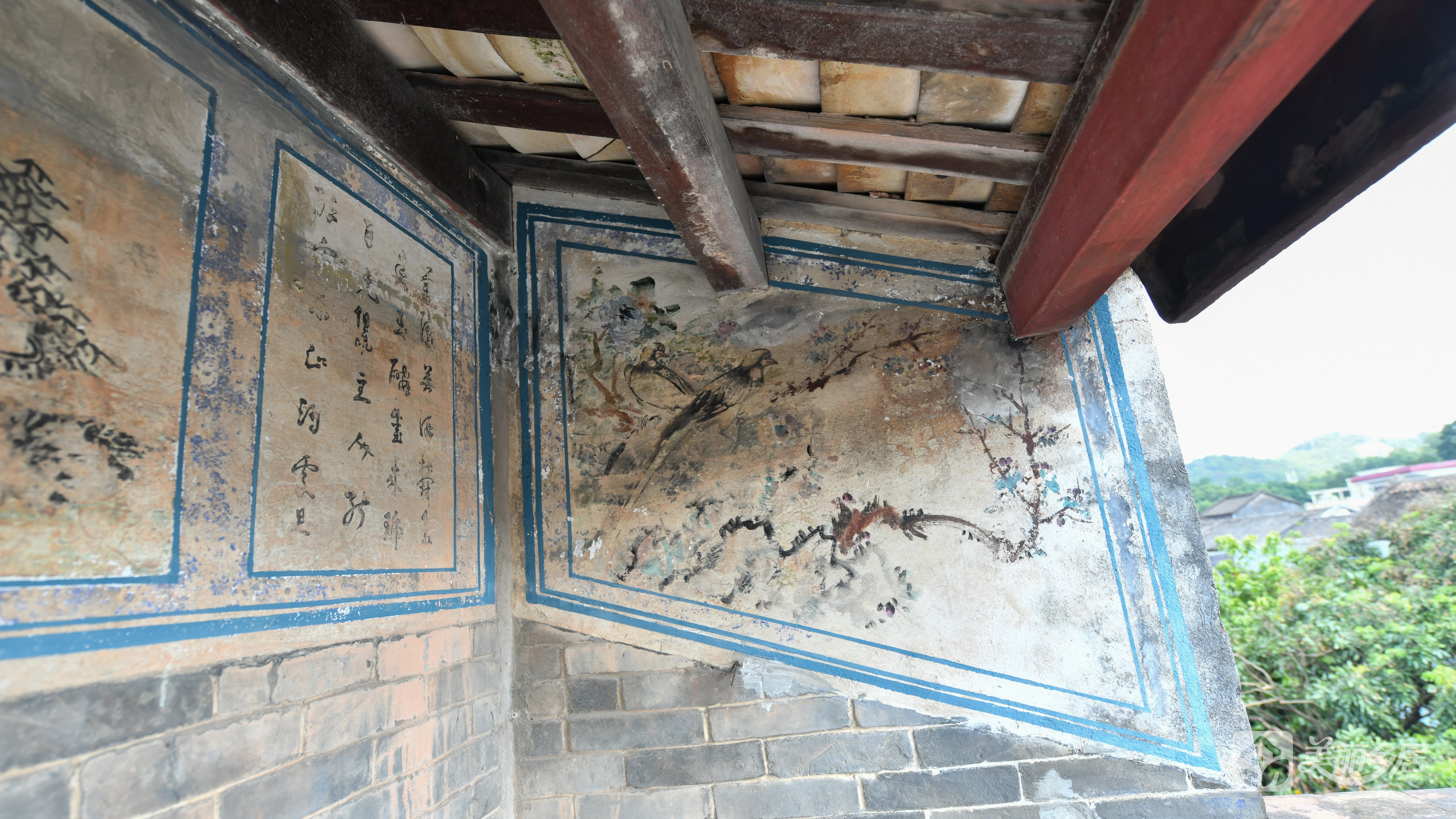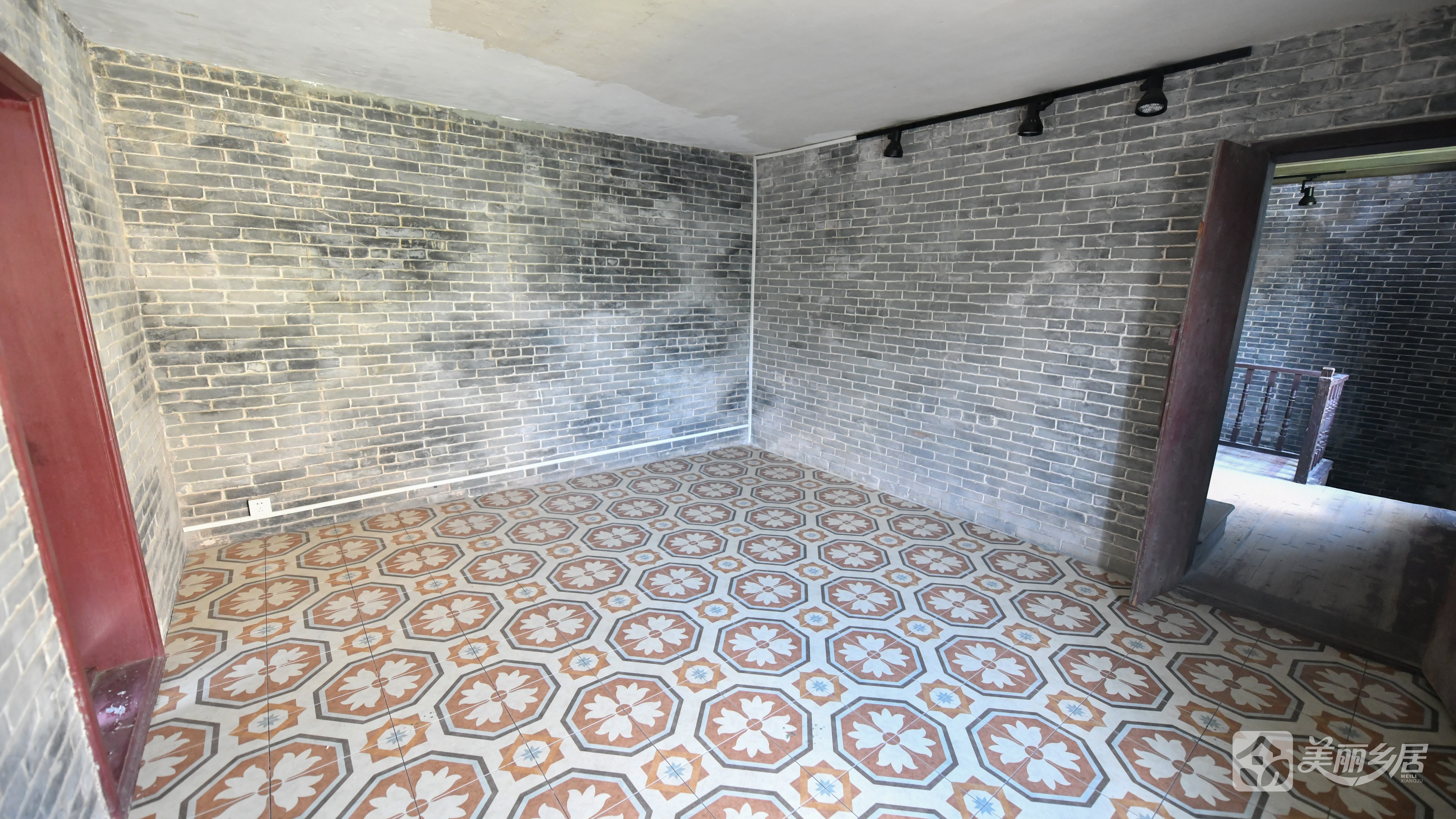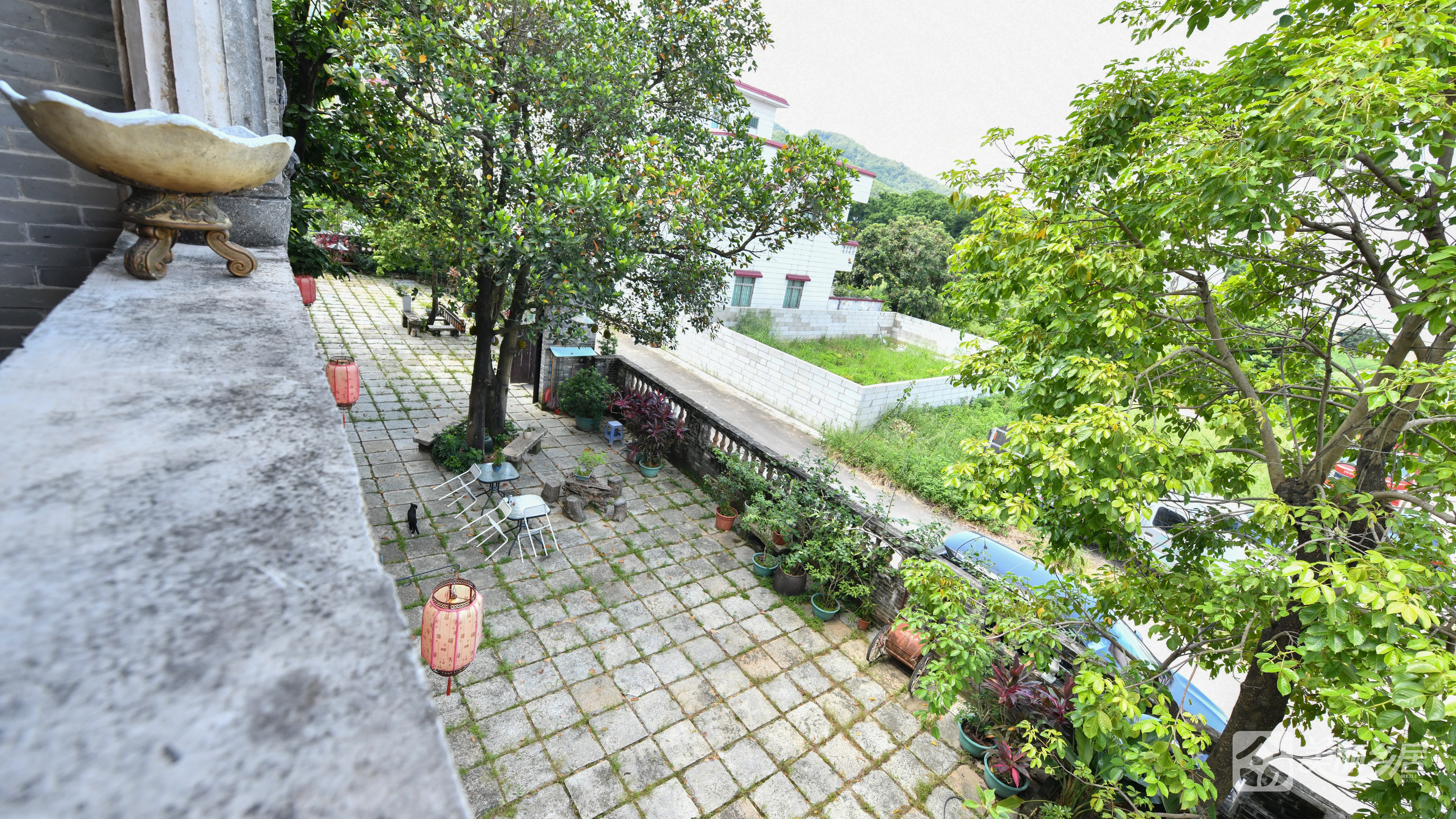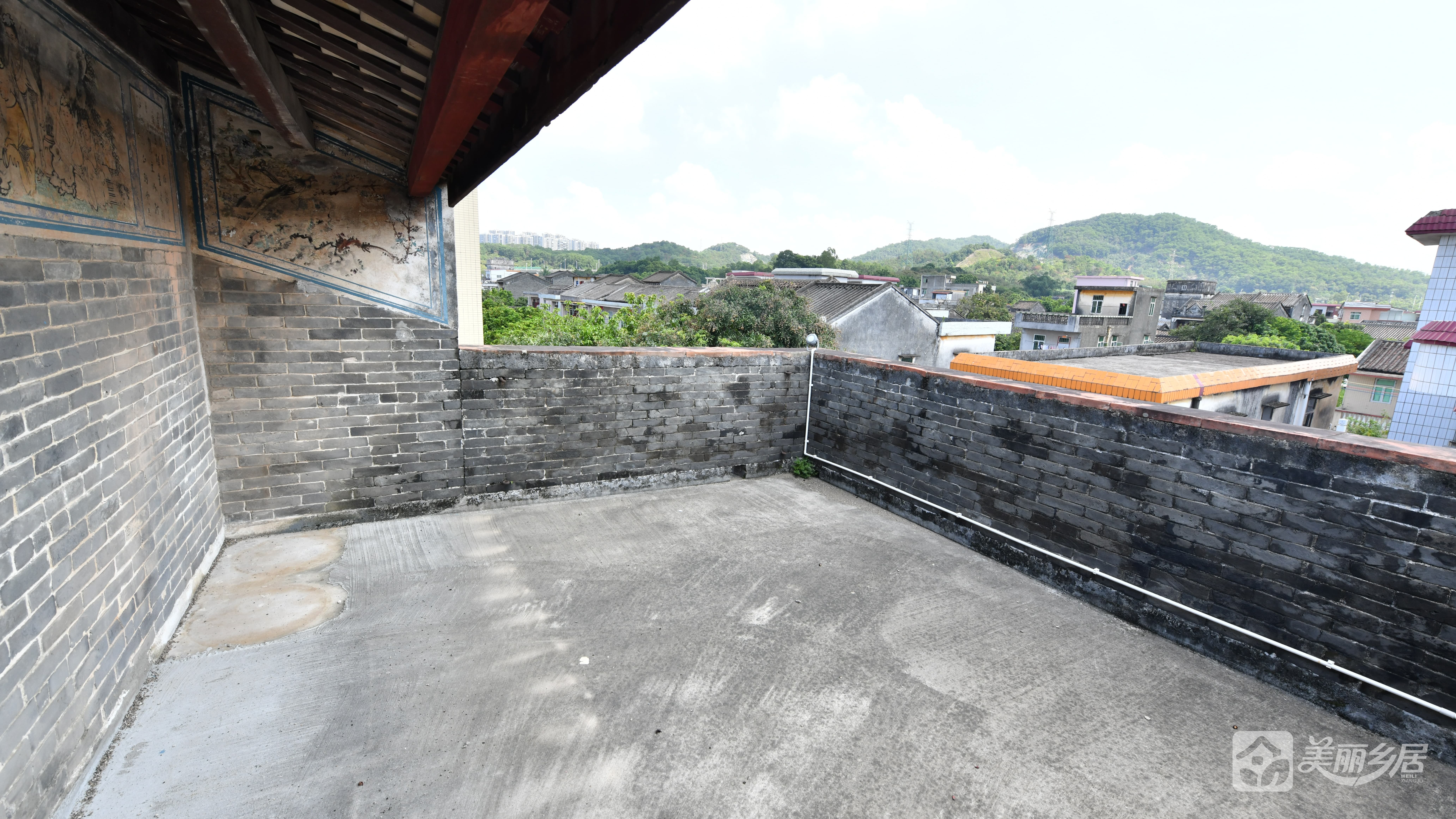 - 天台:地面为水泥材质;一侧青砖墙体排列整齐,墙上保留彩色壁画;边缘设红砖矮墙;远处可俯瞰翠亨村错落民居,背景为青山,视野开阔,适合打造观景或休闲空间。
