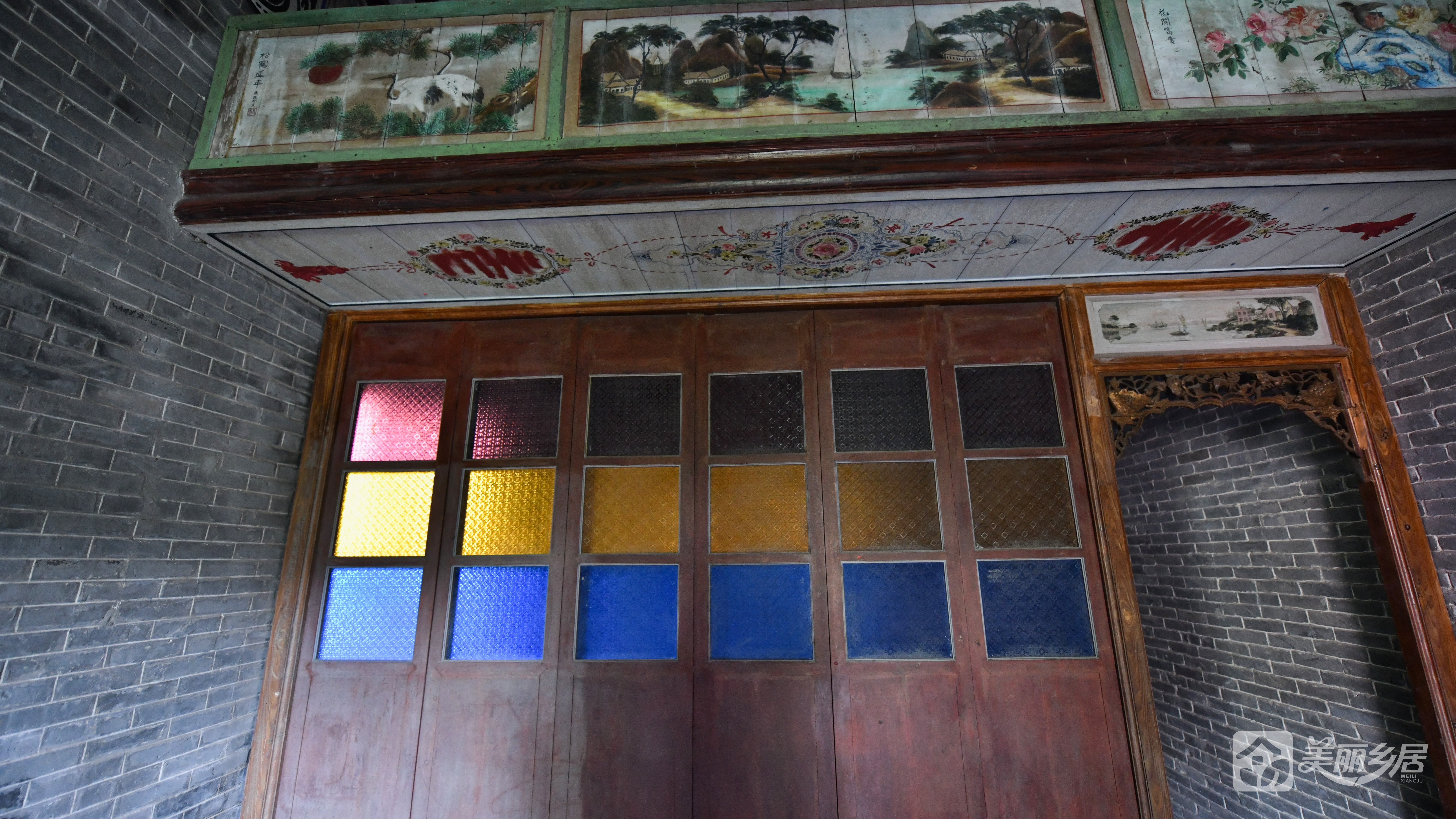 - 入口细节:正门为深棕色木质双开门,门上镶嵌彩色玻璃;门上方绘有山水、花鸟壁画,两侧配木质雕花装饰。