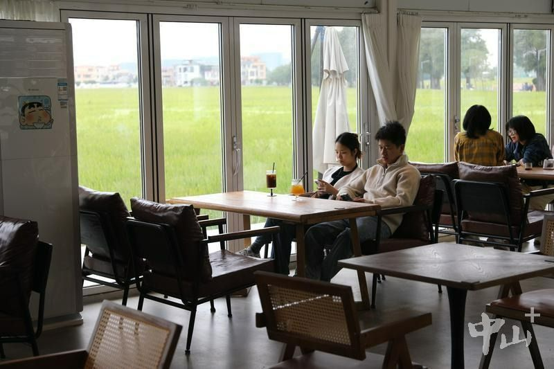 “向云端”咖啡店落地窗外,是大片的稻田。 记者 王云 摄